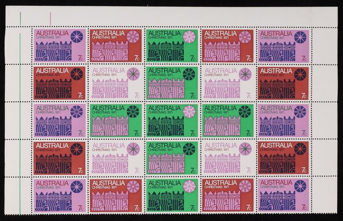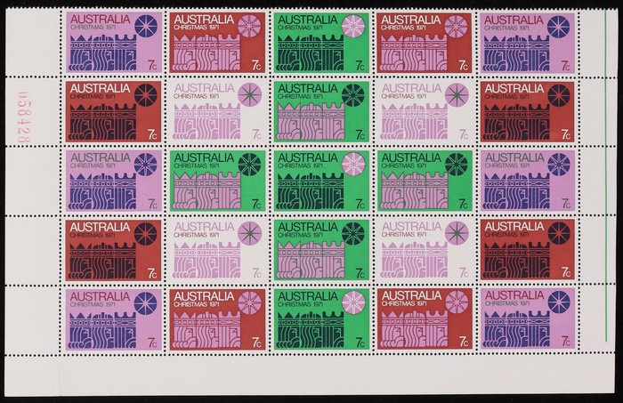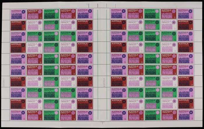 cream paper sheet of 100 with full Autotrons, both black sheet numbers & varieties 'retouch in rust left of A of Australia' (pos RP 5/2), 'broken line at right end of crown on 1st wise man' (RP 5/4, 10/4), 'small weakness in green above 7c' (RP 1/3),