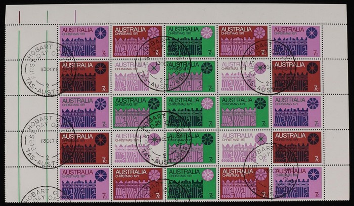UR blk of 25 with part Autotrons at UL cnr. VF CTO 'Hobart GPO/First Day of Issue/13 OC 71/Tas Aust'. ACSC 578 ca cat $60. Scarce & under-rated used. (Image1)