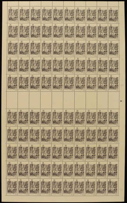 perf 14 x 15, sheet of 100, plated as Sheet C with variety 'stogey in mouth' (pos R3/5). Central gutter fold, fresh MNH. ACSC 678 e cat $50. (100) (Image1)