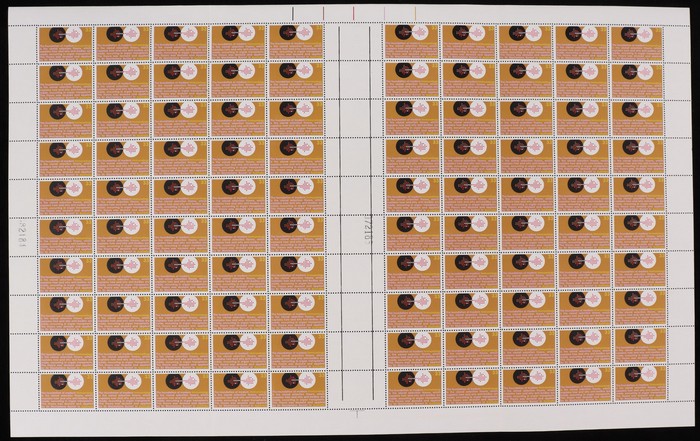 Atomic Absorption sheet of 100 with Autotrons at top, both sheet numbers & ACSC listed variety 'weakness to orange bar at top' (Pos LP6/1) & 'broken O in To' (Pos RP7/2). Fresh MNH. ACSC 705 d e z za zb cat $100. (Image1)