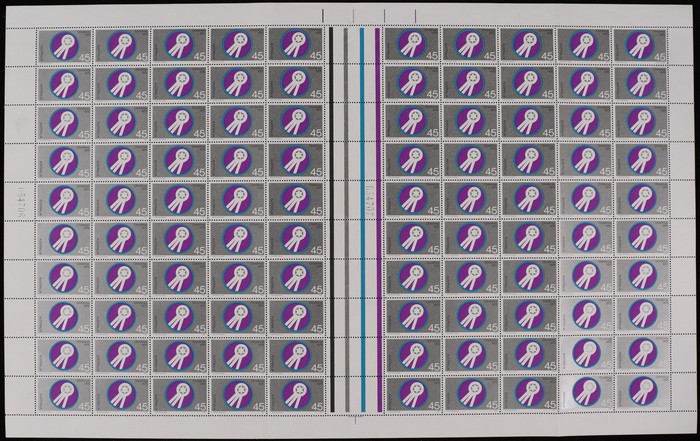 Immunology comp sheet of 100 with Autotrons at top & both sheet numbers & ACSC variety 'weakness in red dots at base of right circle' (pos 10/5). VF MNH. ACSC 707, d z za zb cat $130. (Image1)