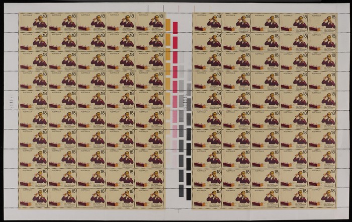 Independence 18c sheet of 100 with Autotrons at left, both black sheet numbers & ACSC listed variety ' flaw in green right of last A of Australia' (Pos LP5/10). VF MNH. ACSC 728 d z za zb cat $75. (Image1)