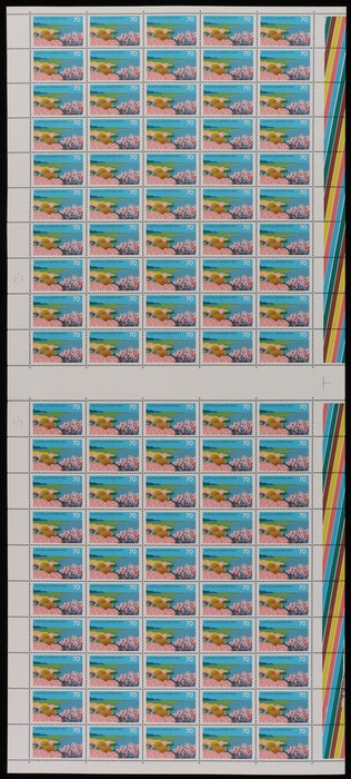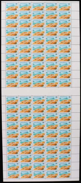 Barrier Reef, sheet of 100, plated as Sheet A with colour bars at right. Some perf separations & rev gum marks on 2 stamps. VF MNH. ACSC 751 z za cat $120. (Image1)