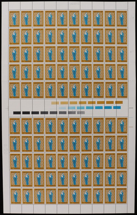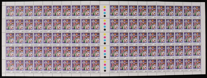 Gifts sheet & 100 with colour control circles in vert gutter & variety 'horizontal green line in US flag' (Pos 2/7, both panes). Couple of light tropical spots effecting a couple of stamps, o/w VF & fresh MNH. ACSC 851 d z cat $90+. (Image1)