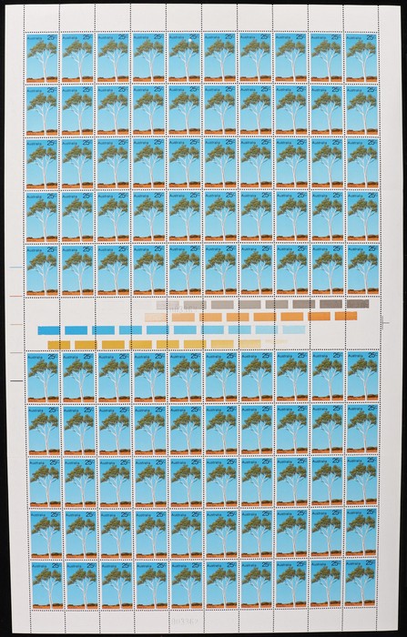 Ghost Gum sheet of 100 on Shoalhaven white paper (blue gum) with Autotrons at left, gutter wedges & both black sheet numbers. VF & fresh MNH. ACSC 797a z za zb cat $70.