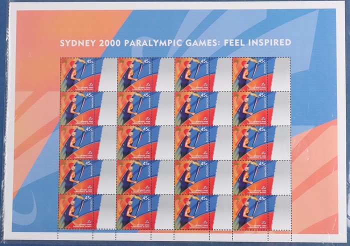 $4.50 SES of 20 45c Torch (2 diff), Teams SES of 10 from NSW, Qld, SA & Vic - these all with generic 'woman' tabs, plus Awards sheetlets of 20 (7 diff). VF fresh MNH. SG 1973-74, 2053-54 (var). FV $99 alone. (13 SES). (Image1) (Image2)