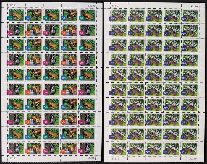 Rainforest def set 50c-$1.45 sheets of 50, the 50c setenant blks of 4. VF fresh MNH. SG 2275-76. FV $97 alone. (2 sheets). (Image1) (Image2)