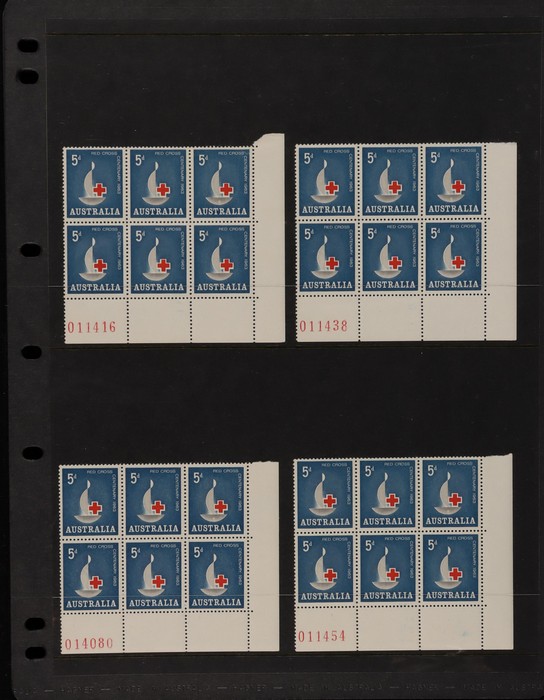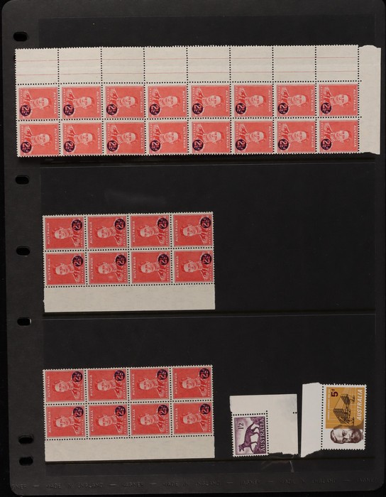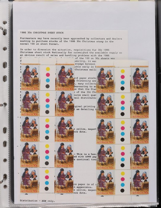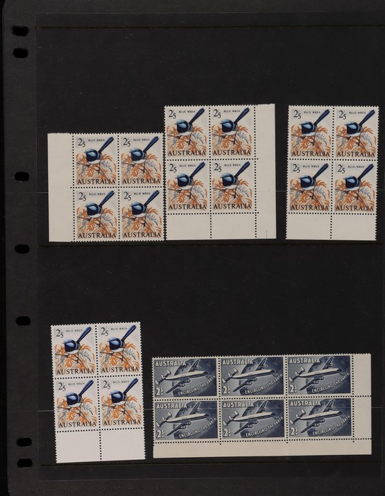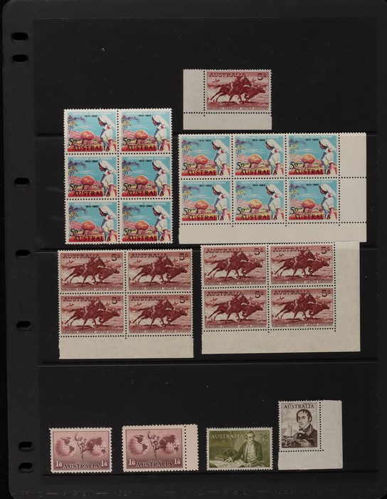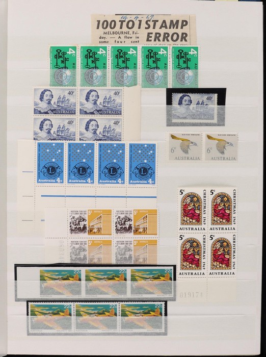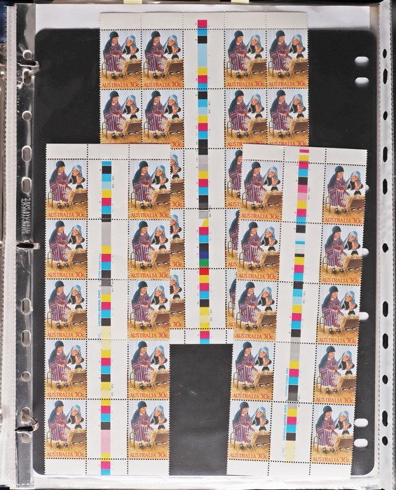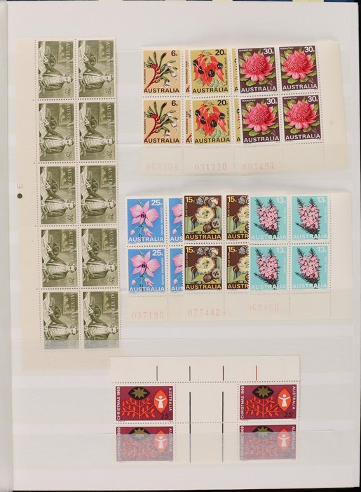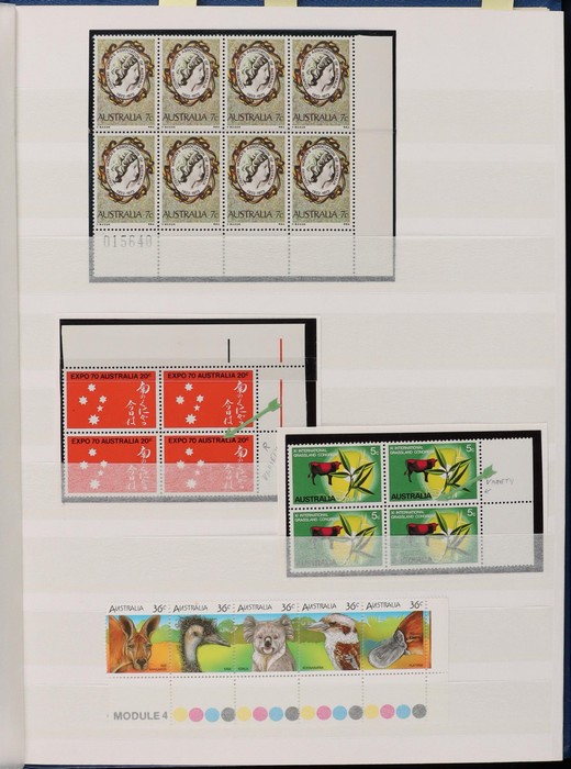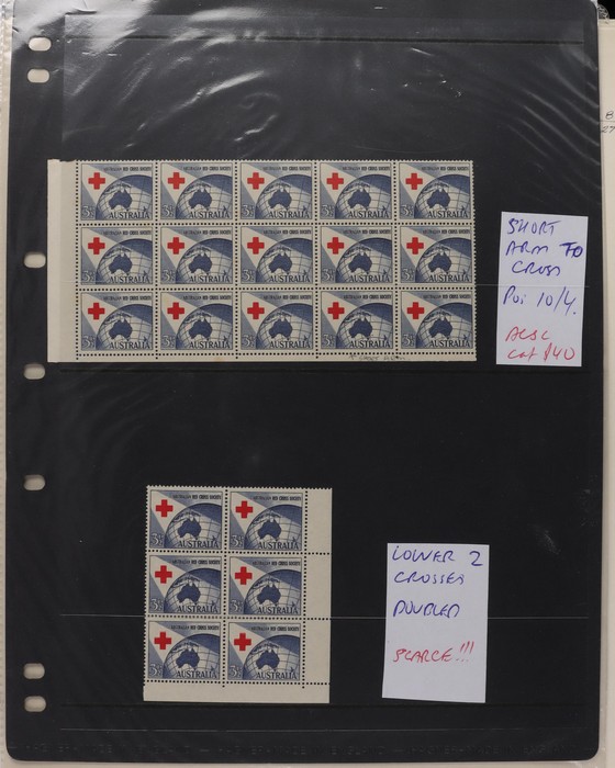 231 image1950s-90s semi-specialised collection on leaves & in hagners with 1954-1965 Pre-Decimal blks & 1965 Christmas sheet n numbers in 1954 Red Cross 'Double?Cross' variety in LR cnr blk of 6.?1966-1975 Blocks & Multiples MNH/M/CTO in 1968 Soil/Medical 5c?She of 100, 1968 Intelsat LR cnr blk of 25, 1971 Civil 7c Sturt's Desert Pea Error 'Missing Buff & misplaced green' vert pr MNH (ACSC 536ce at $ 600). 1971 Christmas 7c blks of 25 (2), one with 'Retouch in green through A of AUST' variety, other 'Break in 1st Wiseman's Crown', (ACSC cat $100 ea). 1979 Parramatta, Bexley & Rockdale Port-Office football bklts (cat $680).?1980 High Court 22c 'Aniline print upper marginal blk of 4 (ACSC cat $ 80). 1986 Platypus Frama printing errors (2). 1986 Christmas 30c set of the 5 diff gutter blks (cat $ 80).?1988 Brisbane Expo vending machine 'Booklet' (5 diff) & now hard to find!! 1993 Counter Printed Stamps 'Painting with Candlesticks' UNISSUED design trials in black with 45c, $1 & NVI set of singles & vert pr (Retail $ 900). Plus much more in 1975 Science Study, 1978 Bird sheet & 1996 Indonesia Joint Issue bklts (2, cat $200). Mixed M/CTO/MNH, total ACSC cat / retail $3400. (100s) (Image1) (Image2) (Image3) (Image4) (Image5) (Image6) (Image7) (Image8) (Image9) (Image10) (Image11) (Image12) (Image13) (Image14) (Image15) (Image16) (Image17) (Image18) (Image19)