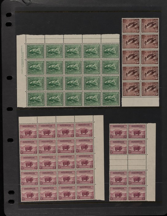226 image1937-1966 Pre Decimal disorganised collection/accumulation in hanger file inc 1934 1/6 Hermes No wmk VF MNH(2). 1937 Zoological series imprint blks multiples inc 2d mauve blk of 12 with medallion flaw. 1948 Arms 5/- to £1, 1941 surcharges in multiples, 5/- Cattle (8) in blks of 4 plus white paper cnr single, 1964 £2 Navigator marginal cnr single, various sheet number blks, noted 1962 Inland Mission in blks of 6 in deep & very pale shade, 1950-60 many different blks & multiples. Inc 2/3 Commems (15) 59 Animals, 59 Flowers (qty), 64 2/5 Bird cream (12) white (4) & 1300 more. Good variety. Generally fresh MNH. ACSC est cat $2000+. (1600+) (Image1) (Image2) (Image3) (Image4) (Image5) (Image6) (Image7) (Image8) (Image9) (Image10) (Image11) (Image12) (Image13)