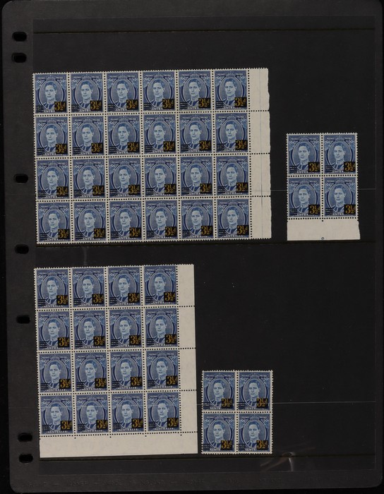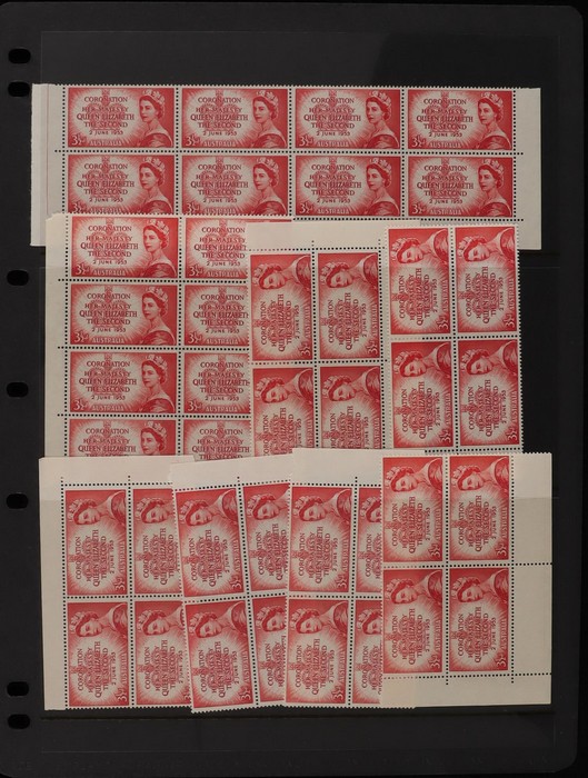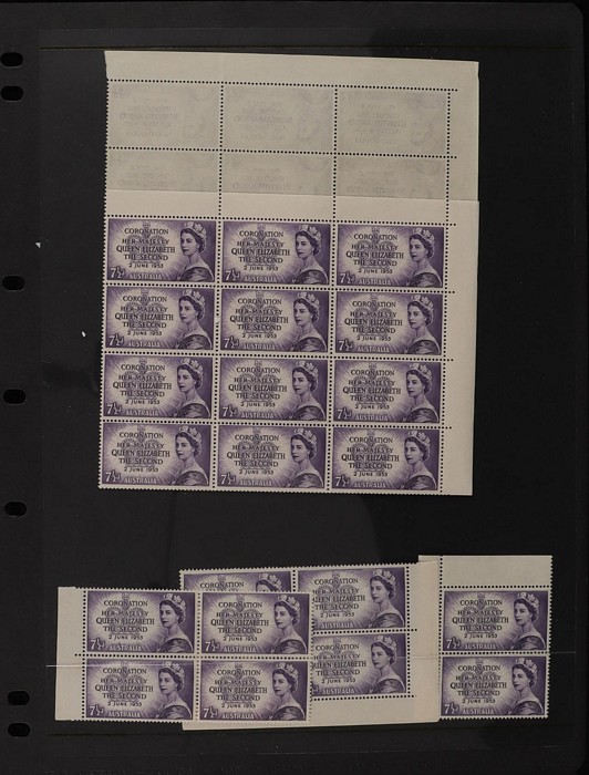 230 image1953 QEII Coronation set 3½d, 7½d & 2/-, 40 sets in blks & multiples. F-VF MNH. SG 264-66 cat £200. ACSC cat $160. (Image1) (Image2) (Image3)