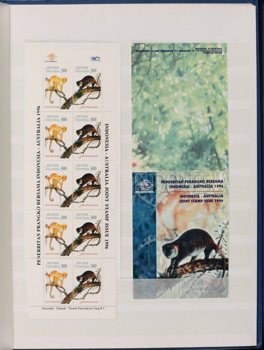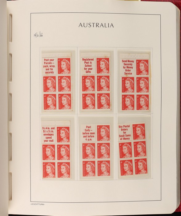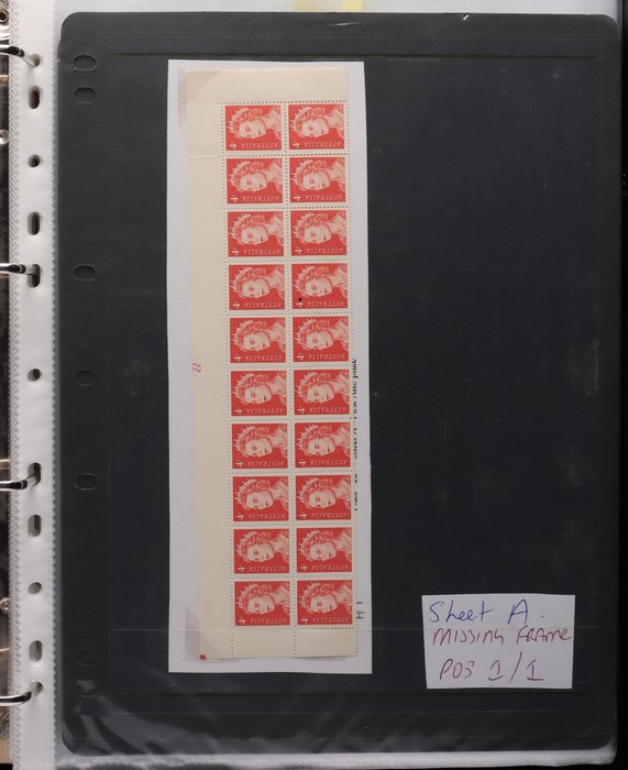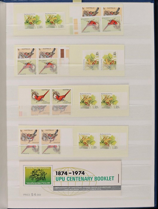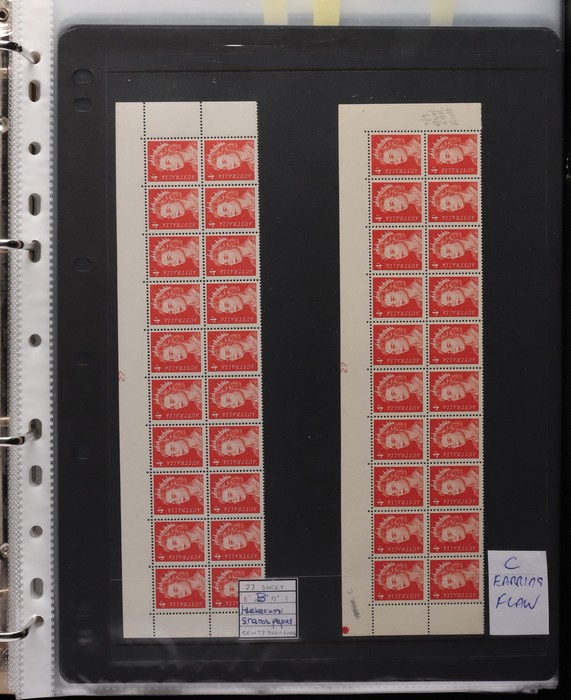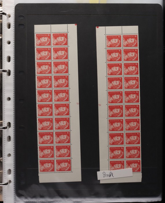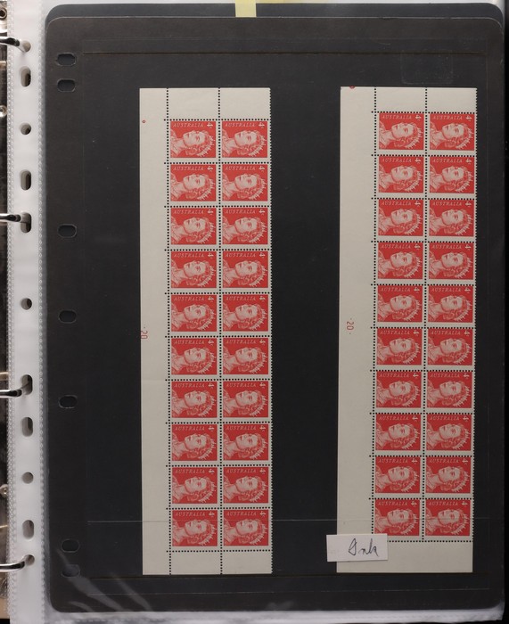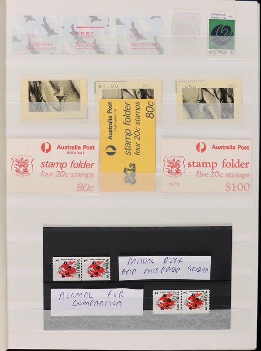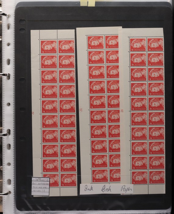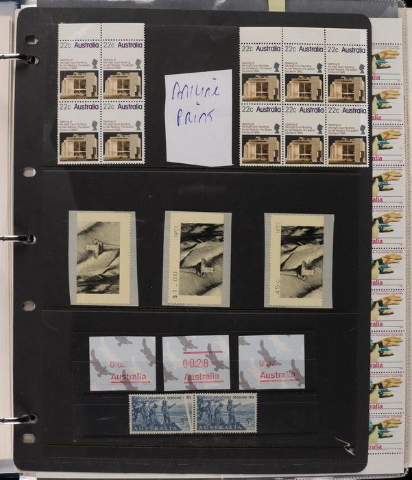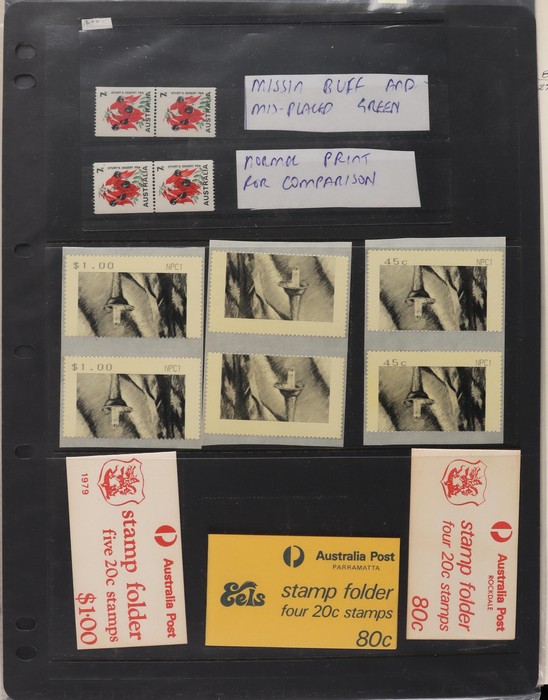234 image1966-1996 Semi-Specialised collection in s/book with 1966 QEII 4c plate nums 27, 28 blks of 20, Navigator 40c Tasman LR cnr blk of 4, 75c Cook Plate num 3 blk o 10, 1960s sheet num blks of 4 inc 1968 Flowers set Red numbers (cat $100), 1971 Coil 7c Sturt's Desert Pea, vert pr Error 'missing buff & misplaced green' (ASCS 536ce cat $600), 1979 NSW Post Office football booklets for Bexley, Parramatta & Rockdale (cat $670), 1980 High Court 22c 'aniline' print blk of 4 (ACSC cat $80). 1980 22c Aeroplane IMPERF strip of 3 (cat $300) 1986 Platypus Frama printing errors (2), 1993 Counter Printed Stamps 'Painting with Candlestick' UNISSUED design trials in black with 45c, $1 & NVI set of 3 (retail $300), 1996 Indonesia Joint Issue Cuscus booklets (2, cat $100ea). Plus others inc 1986 Wildlife 36 strip of 5 with 'MODULE 4' in lwr selvedge & 1974 UPU 7c pane of 50, 30c blk of 25. Generally fresh MNH. ACSC cat/retail $2600. (650). (Image1) (Image2) (Image3) (Image4) (Image5) (Image6) (Image7) (Image8) (Image9) (Image10)