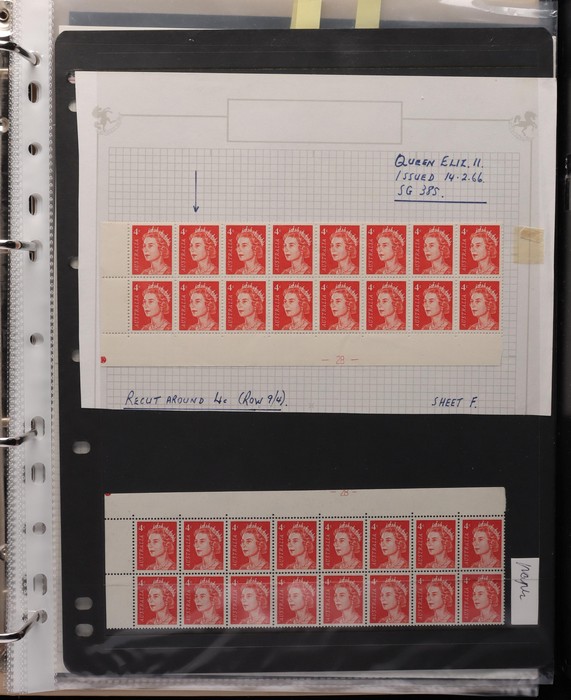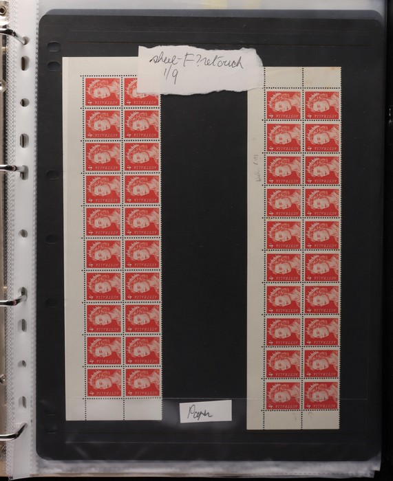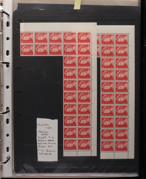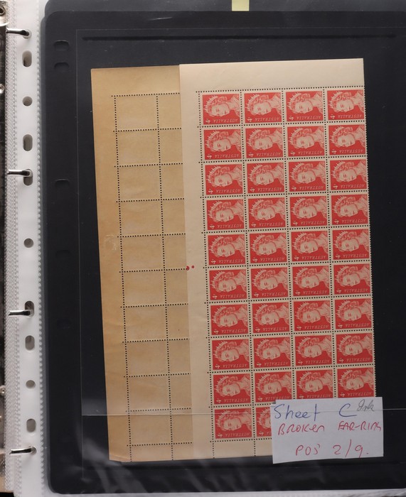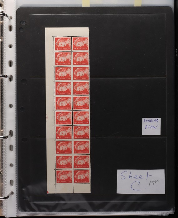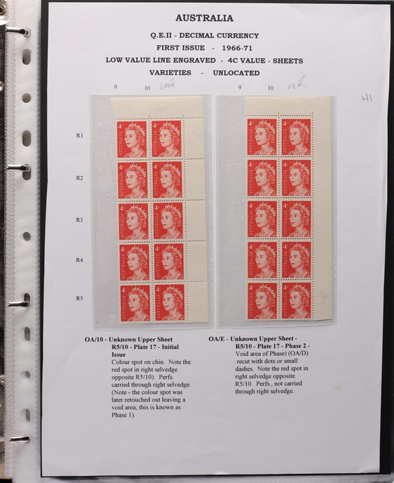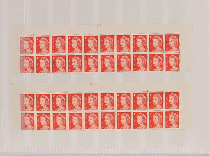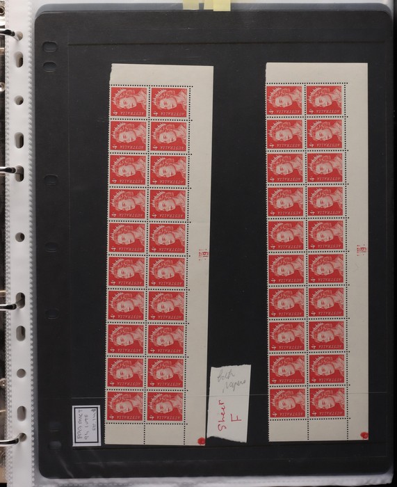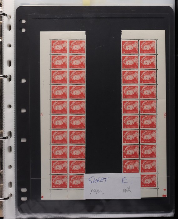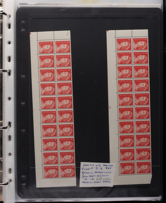 241 image1966 QEII 4c specialised MNH collection (2200) inc comp sheets of 100 (4) for Sheets A, C, D, F. Panes of 50 (8) inc plates 26 & 28. large part sheets of 80 (3). Plate number blks of 20 (30) inc 17 lower (cat $150). Upper marginal Sheet C blks (7) with 20, 21 (2), 22, 24, 37 & -28-, all with 'ear-ring flaws' (Pos 2/9) cat $30 ea. Upper marginal Sheet A blks 'missing vert frame al LL cnr' (Pos 1/1) for -21- & -22- cat $40 ea. Sheet F study (300+) mostly positional inc plate -28- blk of 16 & irregular blks of 36 & 26, lower marginal blk of 20, all with 'recuts around 4c' variety (Pos 9/4, cat $30 ea) & 'retouches below 4c' (Pos 1/9, cat $35 ea) in upper marginal blks of 20 (3). Generally fresh & clean, mostly VF MNH. ACSC cat $1900+. (2200) (Image1) (Image2) (Image3) (Image4) (Image5) (Image6) (Image7) (Image8) (Image9) (Image10) (Image11) (Image12) (Image13) (Image14) (Image15) (Image16) (Image17) (Image18) (Image19) (Image20) (Image21) (Image22) (Image23) (Image24) (Image25) (Image26) (Image27)