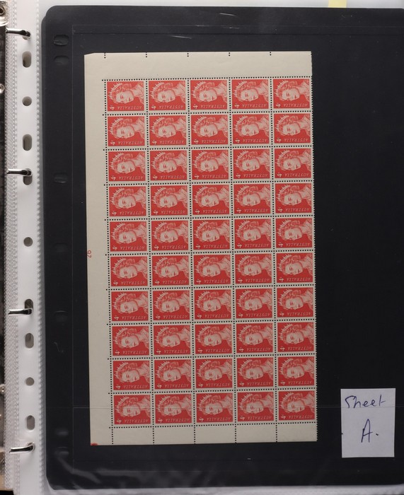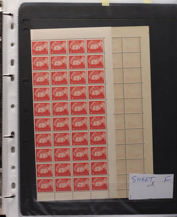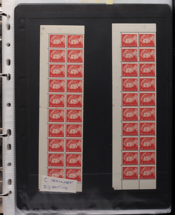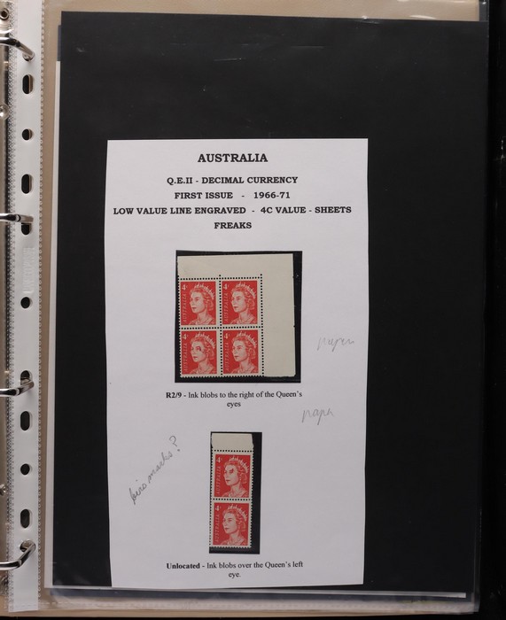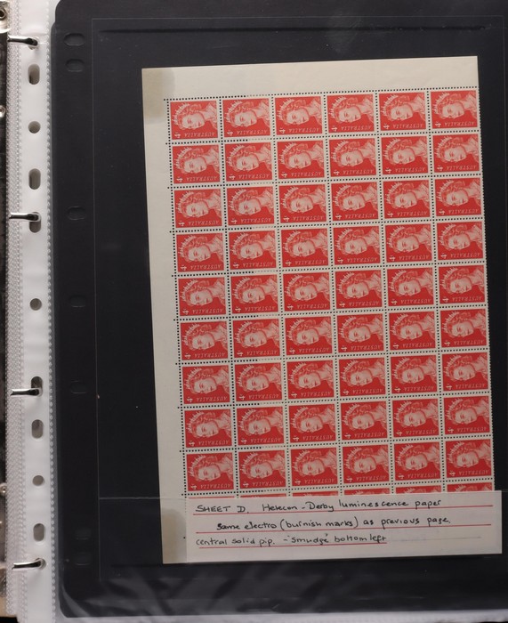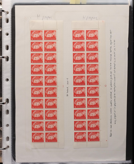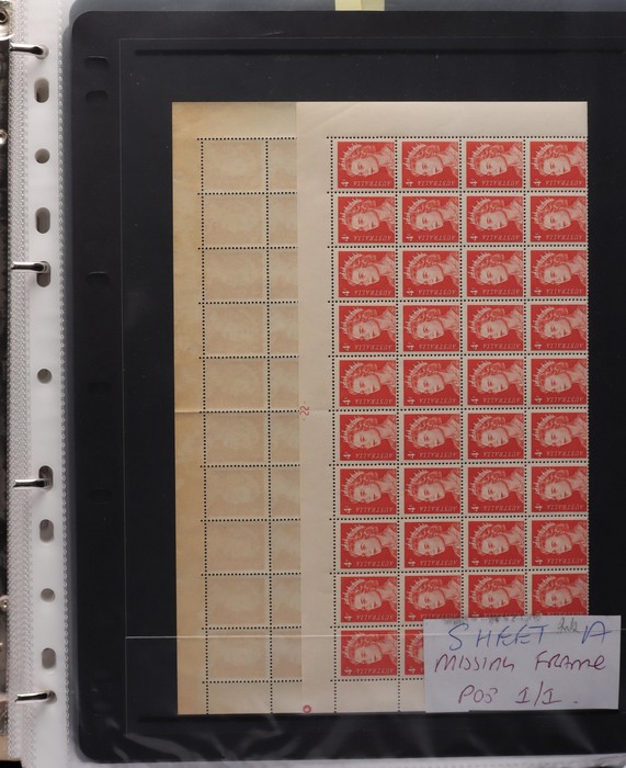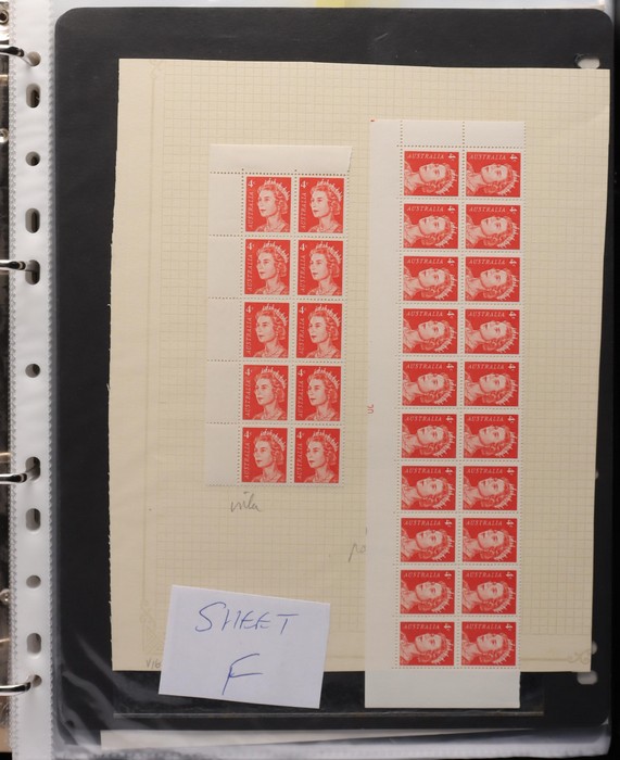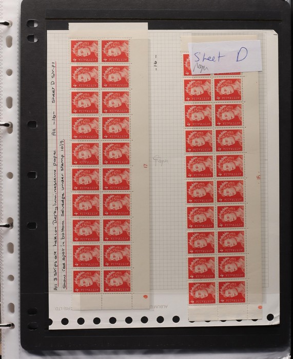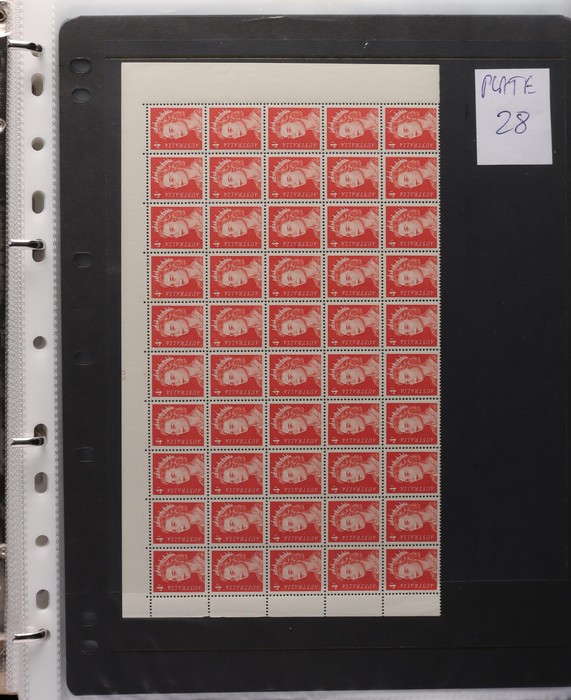 241 image1966 QEII 4c specialised MNH collection (2200) inc comp sheets of 100 (4) for Sheets A, C, D, F. Panes of 50 (8) inc plates 26 & 28. large part sheets of 80 (3). Plate number blks of 20 (30) inc 17 lower (cat $150). Upper marginal Sheet C blks (7) with 20, 21 (2), 22, 24, 37 & -28-, all with 'ear-ring flaws' (Pos 2/9) cat $30 ea. Upper marginal Sheet A blks 'missing vert frame al LL cnr' (Pos 1/1) for -21- & -22- cat $40 ea. Sheet F study (300+) mostly positional inc plate -28- blk of 16 & irregular blks of 36 & 26, lower marginal blk of 20, all with 'recuts around 4c' variety (Pos 9/4, cat $30 ea) & 'retouches below 4c' (Pos 1/9, cat $35 ea) in upper marginal blks of 20 (3). Generally fresh & clean, mostly VF MNH. ACSC cat $1900+. (2200) (Image1) (Image2) (Image3) (Image4) (Image5) (Image6) (Image7) (Image8) (Image9) (Image10) (Image11) (Image12) (Image13) (Image14) (Image15) (Image16) (Image17) (Image18) (Image19) (Image20) (Image21) (Image22) (Image23) (Image24) (Image25) (Image26) (Image27)