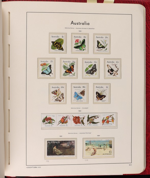 235 image1966-87 decimal collection comp in Seven Seas hingeless album, 1966 Defs to $4 (inc both perfs of $1), SPECIMEN set of 4 to $4, 4c booklet panes set of 6 slogans, similar 5c on 4c, plus FA & PM panes. All better early 1970s Commem sets inc 1971 Christmas 7c blks of 7, 25 & 50 inc white & cream papers, Paintings to $10. Seems fairly comp, all diff, many sets, few varieties noted inc 10c Gemstone SG 552cc printed on gum side (cat £50), 18c Flower SG 608a black missing (cat £42). Some paper tones on outside, mostly not effecting stamps. Few earlies fresh VF MLH (toning on some stamps), mainly fresh VF MNH. FV $230+ retail approx $1000, plus extra for hingeless album $500. (700) (Image1) (Image2) (Image3) (Image4) (Image5) (Image6) (Image7) (Image8) (Image9) (Image10) (Image11) (Image12) (Image13) (Image14)