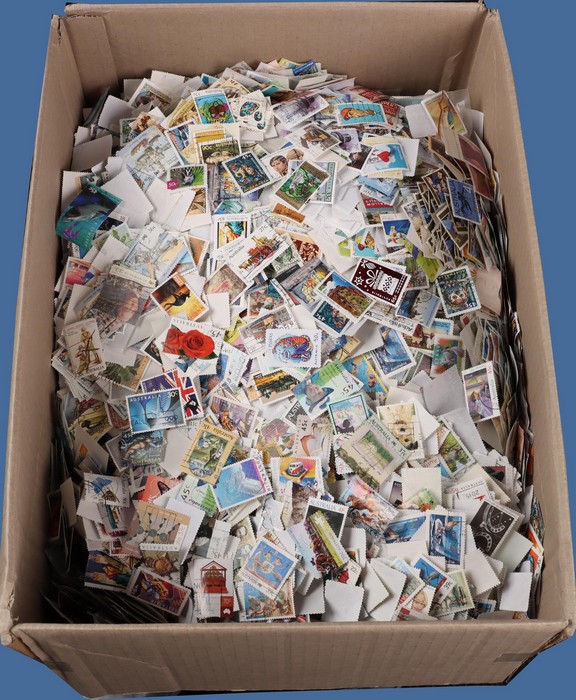 238 image1966-c2000 used mainly decimal off-paper mix. Appears excellent variety (we never got to the bottom of the box). Did note a few pre-dec & the odd Foreign. Weight 8.5kg. Appear mainly larger size stamps. (Estimate about 100,000 stamps). (Image1)