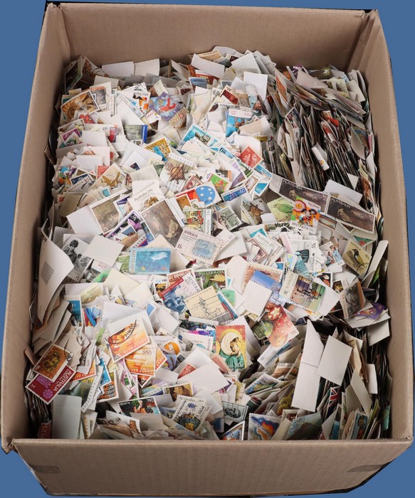 237 image1966-2000 used, decimal off-paper mix. Appears excellent variety (we never got to the bottom of the box). Appear mainly larger size stamps. (Estimate about 90,000-100,000 stamps). Weight 8kg. (Image1)