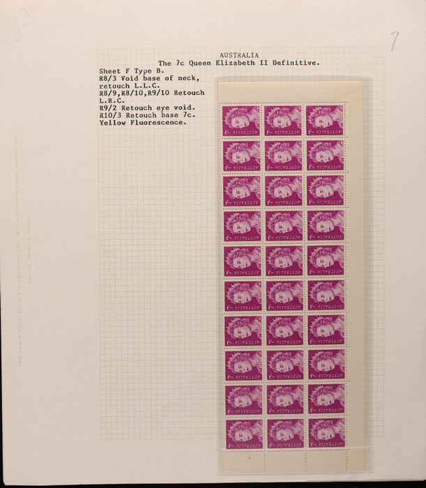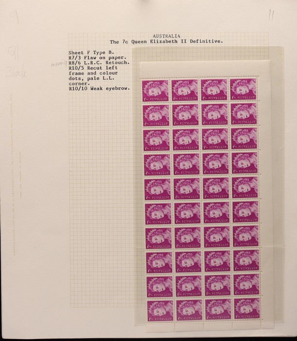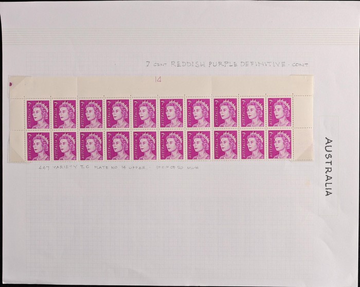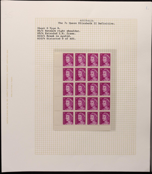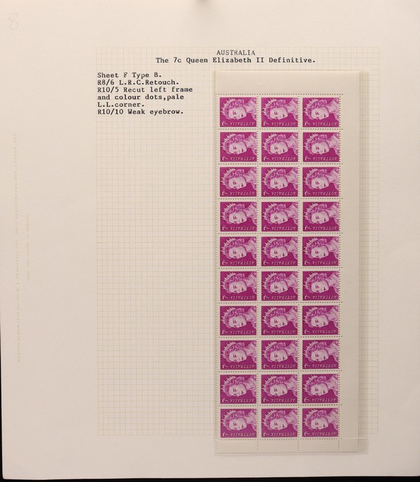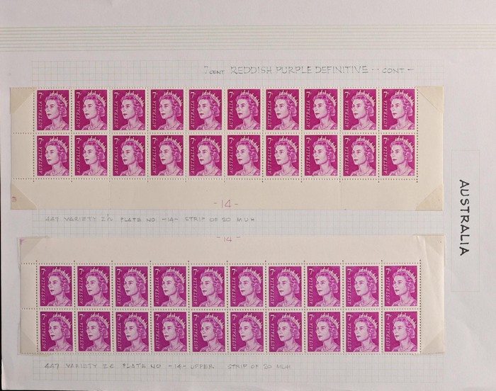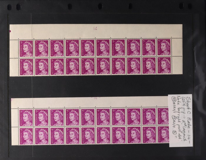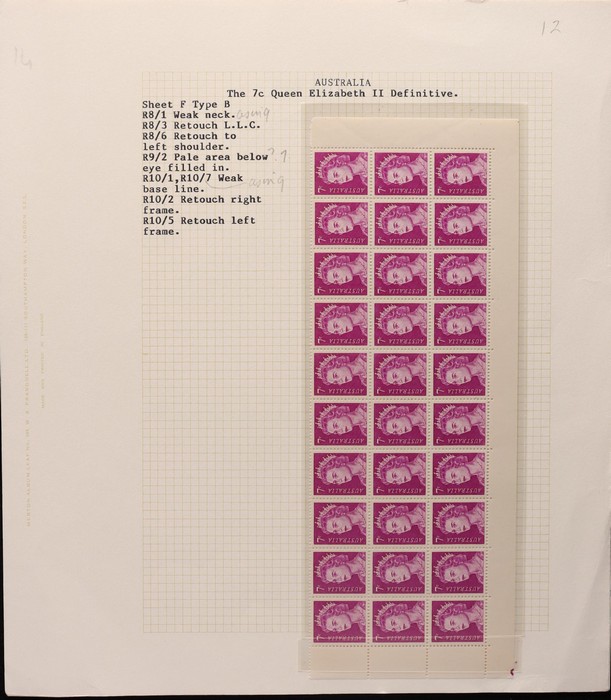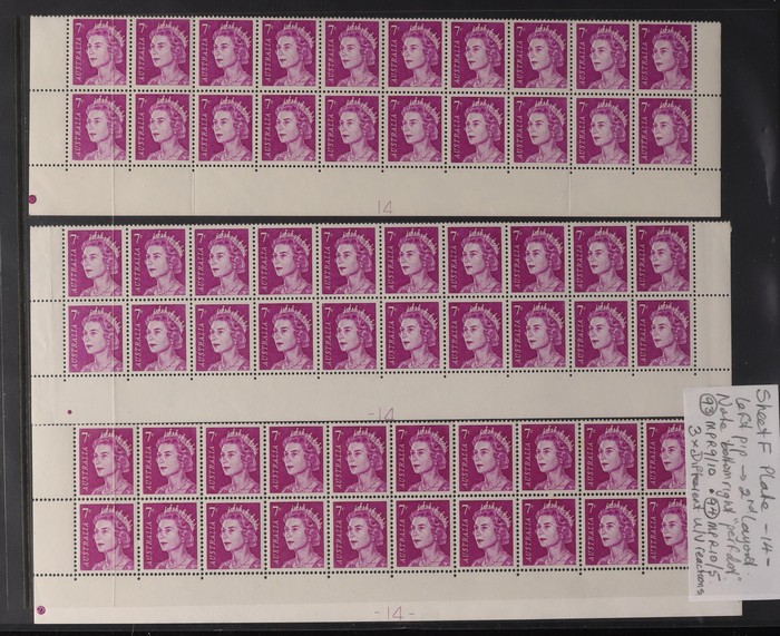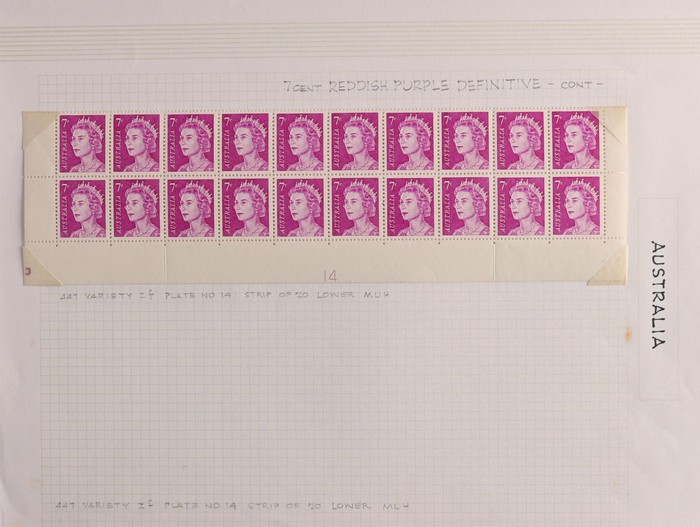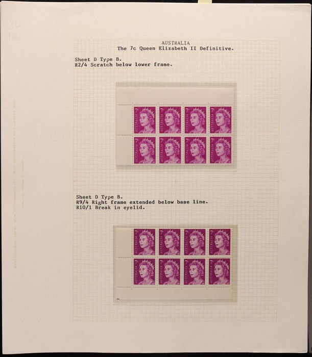 242 image1966-71 QEII 7c purple specialised collection (1800) on leaves in springback album with plate number 14 blks of 20 (10, cat $300), Sheet A UL cnr blks of 49 (2) inc 'line through pearl' (Pos 1/2) & 'pale face' (4/5). Sheet B upper pane of 50 wiith type VI perf-pips & lower panes & blks of 50 (2), 30 (2) & 20 (2). Sheet C upper marginal part plate 14 blks of 20 (2). Sheet D blks in lower panes of 50 (3) inc 'missing shading lines near Queen's eye' (Pos 8/10) & LK cnr blk of 6 (3x2) with above variety retouched UL cnr blks of 8 (2) & blk of 12. LL cnr blks of 20 (4x5) & of 8 (2x4). LR cnr blks of 9 & 21 (7x3). Sheet E upper panes of 50 (2) both with 'pearl flaw' (Pos 1/1). UR cnr blks of 9 (2). Lower panes of 50 w/o plate number (4), lower marginal blk of 30 & plate -14 blk of 20, all with 'weak hair' varieties (Pos 10/10). LL cnr blks of 20 (5 diff). Sheet F upper pane of 50 & UR cnr blks of 10 (2). Lower panes of 50 (2), pane of 40, panes of 30 (4) w/o plate numbers, all with left frame varieties (Pos 10/5). Also plate -14- blks of 20 (3). All appear fresh MNH. ACSC cat over $1000. (1800) (Image1) (Image2) (Image3) (Image4) (Image5) (Image6) (Image7) (Image8) (Image9) (Image10) (Image11) (Image12) (Image13) (Image14) (Image15) (Image16) (Image17) (Image18) (Image19) (Image20) (Image21) (Image22) (Image23) (Image24) (Image25) (Image26) (Image27) (Image28) (Image29) (Image30)