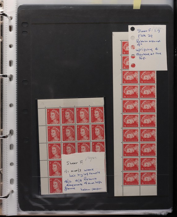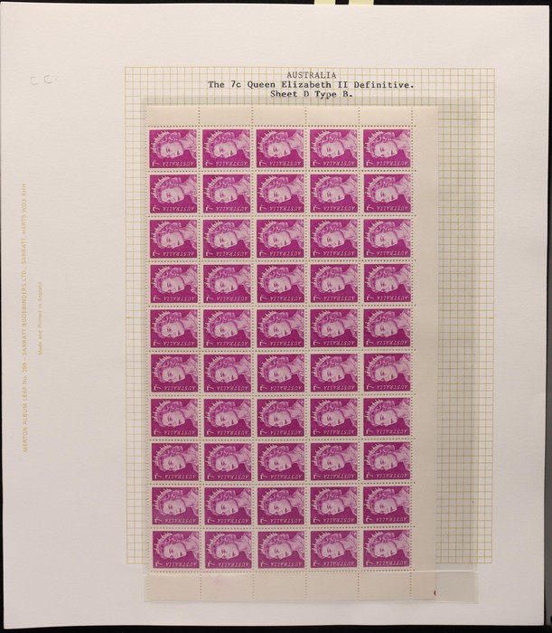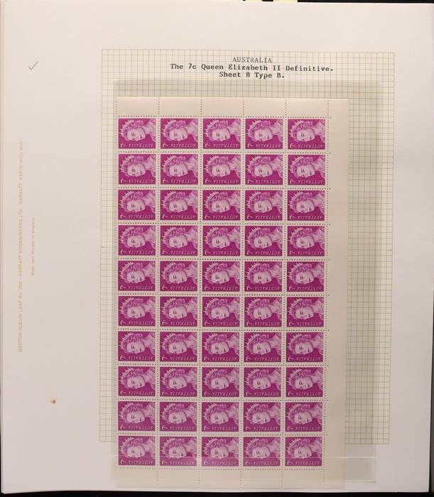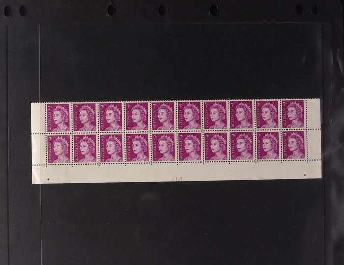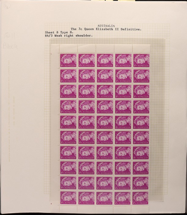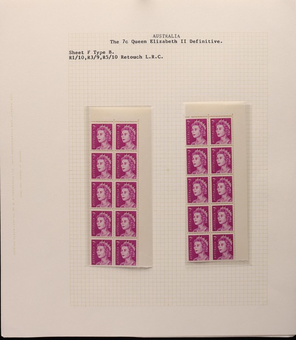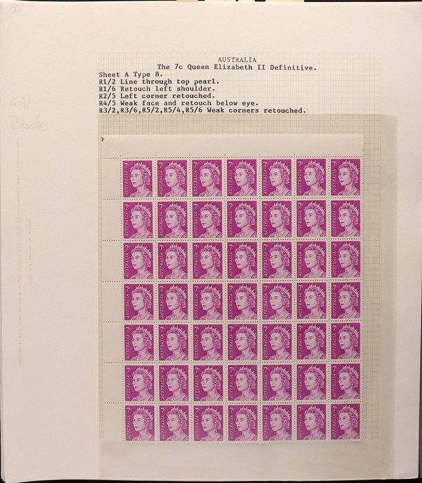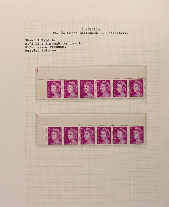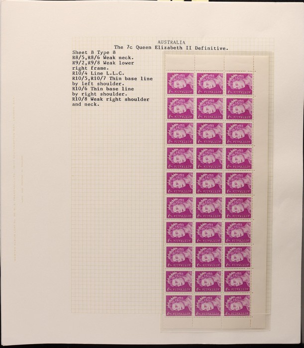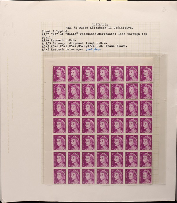 242 image1966-71 QEII 7c purple specialised collection (1800) on leaves in springback album with plate number 14 blks of 20 (10, cat $300), Sheet A UL cnr blks of 49 (2) inc 'line through pearl' (Pos 1/2) & 'pale face' (4/5). Sheet B upper pane of 50 wiith type VI perf-pips & lower panes & blks of 50 (2), 30 (2) & 20 (2). Sheet C upper marginal part plate 14 blks of 20 (2). Sheet D blks in lower panes of 50 (3) inc 'missing shading lines near Queen's eye' (Pos 8/10) & LK cnr blk of 6 (3x2) with above variety retouched UL cnr blks of 8 (2) & blk of 12. LL cnr blks of 20 (4x5) & of 8 (2x4). LR cnr blks of 9 & 21 (7x3). Sheet E upper panes of 50 (2) both with 'pearl flaw' (Pos 1/1). UR cnr blks of 9 (2). Lower panes of 50 w/o plate number (4), lower marginal blk of 30 & plate -14 blk of 20, all with 'weak hair' varieties (Pos 10/10). LL cnr blks of 20 (5 diff). Sheet F upper pane of 50 & UR cnr blks of 10 (2). Lower panes of 50 (2), pane of 40, panes of 30 (4) w/o plate numbers, all with left frame varieties (Pos 10/5). Also plate -14- blks of 20 (3). All appear fresh MNH. ACSC cat over $1000. (1800) (Image1) (Image2) (Image3) (Image4) (Image5) (Image6) (Image7) (Image8) (Image9) (Image10) (Image11) (Image12) (Image13) (Image14) (Image15) (Image16) (Image17) (Image18) (Image19) (Image20) (Image21) (Image22) (Image23) (Image24) (Image25) (Image26) (Image27) (Image28) (Image29) (Image30)