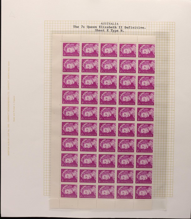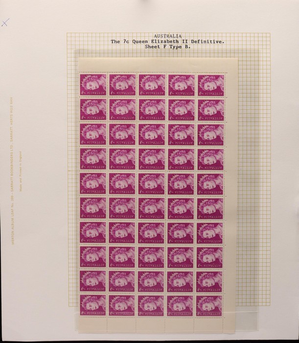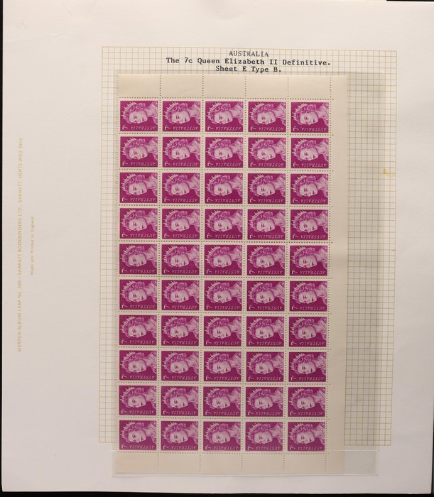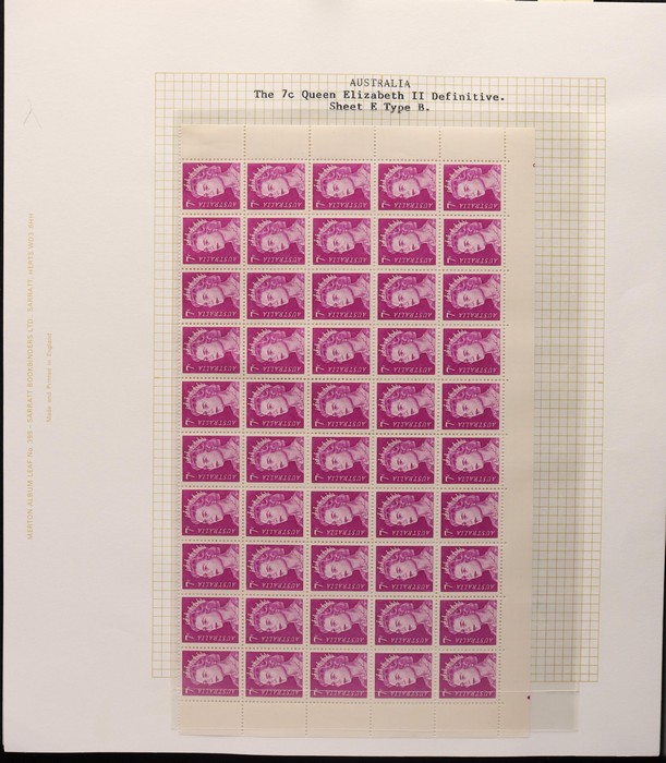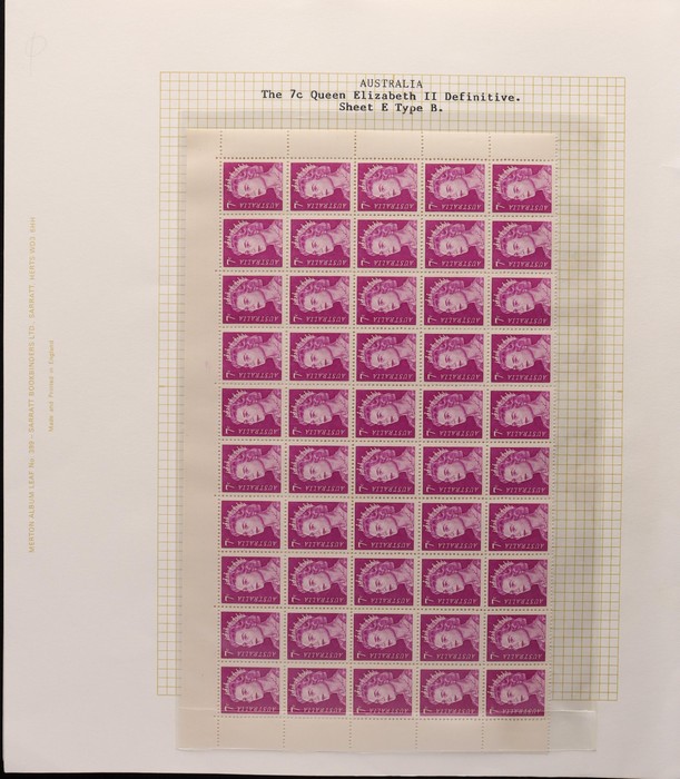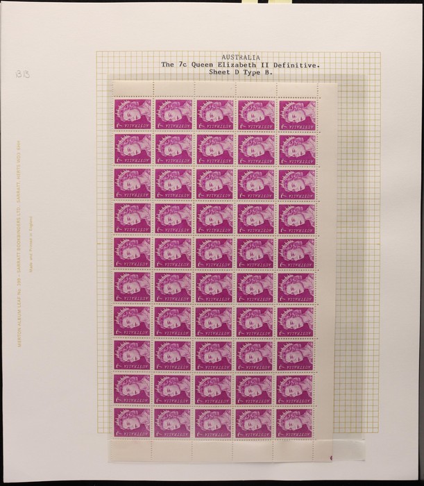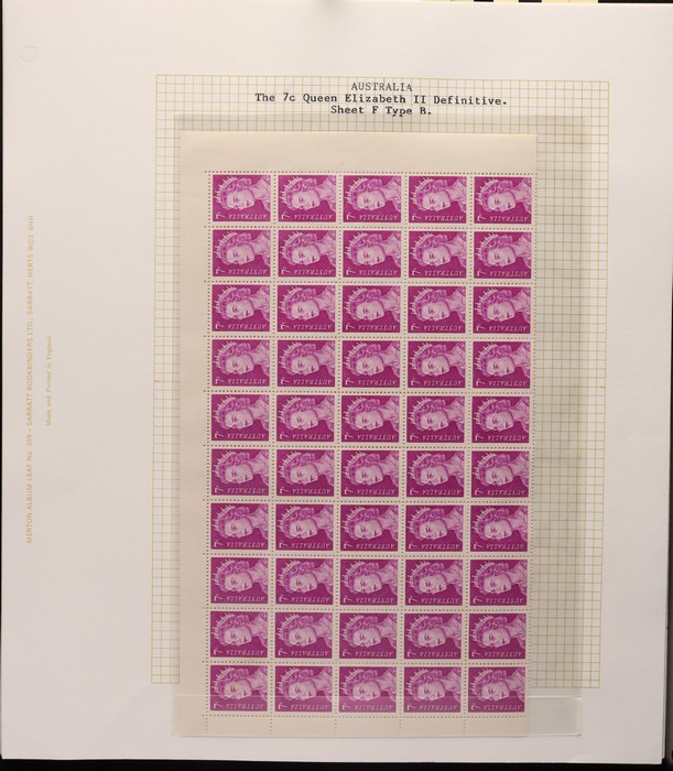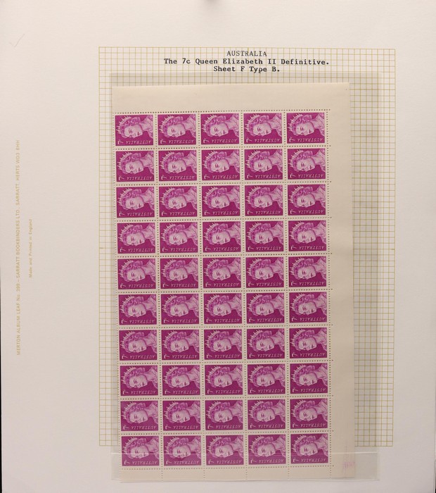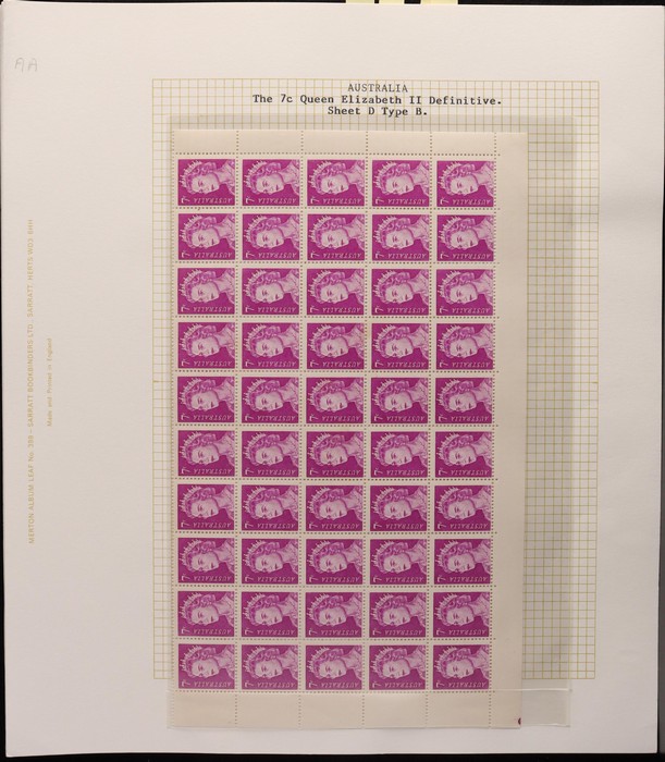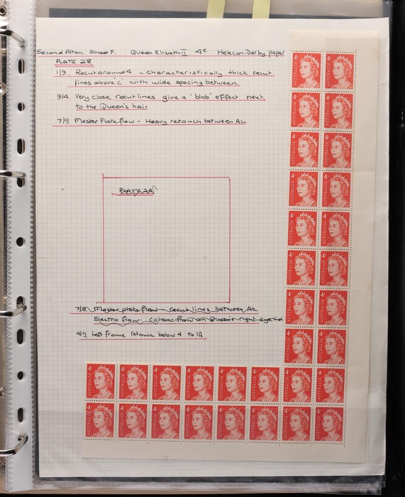 242 image1966-71 QEII 7c purple specialised collection (1800) on leaves in springback album with plate number 14 blks of 20 (10, cat $300), Sheet A UL cnr blks of 49 (2) inc 'line through pearl' (Pos 1/2) & 'pale face' (4/5). Sheet B upper pane of 50 wiith type VI perf-pips & lower panes & blks of 50 (2), 30 (2) & 20 (2). Sheet C upper marginal part plate 14 blks of 20 (2). Sheet D blks in lower panes of 50 (3) inc 'missing shading lines near Queen's eye' (Pos 8/10) & LK cnr blk of 6 (3x2) with above variety retouched UL cnr blks of 8 (2) & blk of 12. LL cnr blks of 20 (4x5) & of 8 (2x4). LR cnr blks of 9 & 21 (7x3). Sheet E upper panes of 50 (2) both with 'pearl flaw' (Pos 1/1). UR cnr blks of 9 (2). Lower panes of 50 w/o plate number (4), lower marginal blk of 30 & plate -14 blk of 20, all with 'weak hair' varieties (Pos 10/10). LL cnr blks of 20 (5 diff). Sheet F upper pane of 50 & UR cnr blks of 10 (2). Lower panes of 50 (2), pane of 40, panes of 30 (4) w/o plate numbers, all with left frame varieties (Pos 10/5). Also plate -14- blks of 20 (3). All appear fresh MNH. ACSC cat over $1000. (1800) (Image1) (Image2) (Image3) (Image4) (Image5) (Image6) (Image7) (Image8) (Image9) (Image10) (Image11) (Image12) (Image13) (Image14) (Image15) (Image16) (Image17) (Image18) (Image19) (Image20) (Image21) (Image22) (Image23) (Image24) (Image25) (Image26) (Image27) (Image28) (Image29) (Image30)