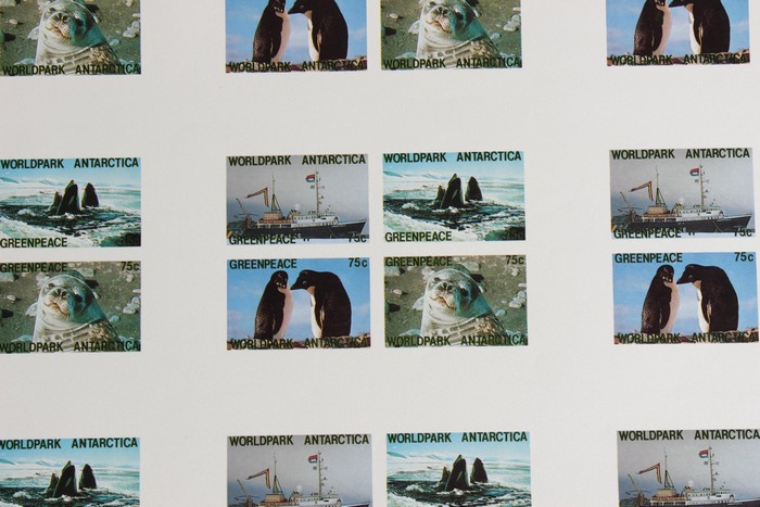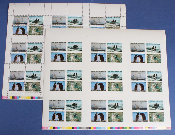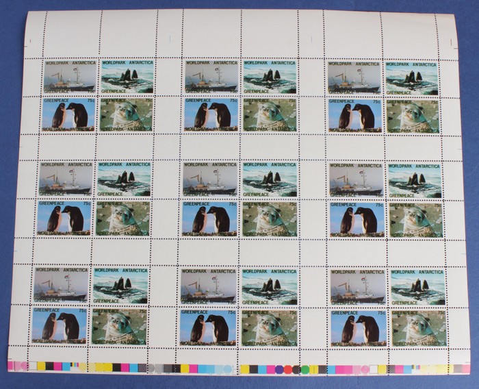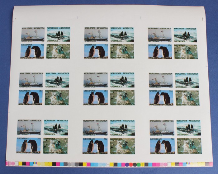World Park Antarctica 75c x 4 M/Sheet in uncut blk of 9 M/S, both perf & imperf. VF fresh MNH. (72 stamps in 18 M/S) (Image1) (Image2)