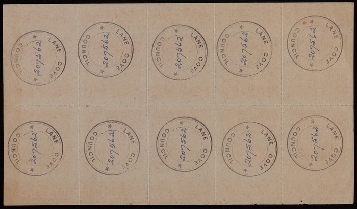 Coupon NSW 1 Gallon orange series B tete-beche sheet of 10 with Authority Imprint at right VF UN with Lane Cove Council cachets on rev. (Image1) (Image2)