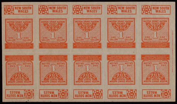 Coupons WWII group with NSW Series A 1 Gallon black (4) inc tete-beche imprint pr & 5 Gallon magenta (11) inc tete-beche sheet of 10. NSW Series B with 5 Gallon violet tete-beche prs (2), one with Authority imprint, 10 Gallon green & 44 Gallon