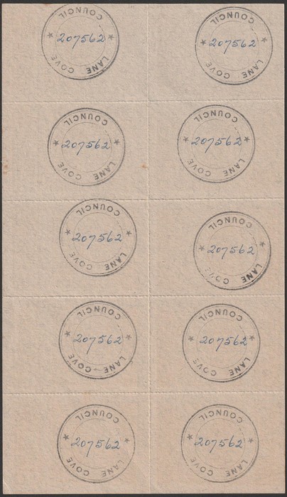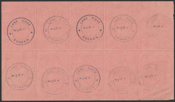 Coupon: NSW: 44 Gallons magenta series B tete-beche sheet of 10 with Authority Imprint at right & Lane Cove Council 'security' cachets on reverse. Some reverse toning & lwr right cnr stamp replaced. An attractive & very scarce multiple. (P) (Image1)