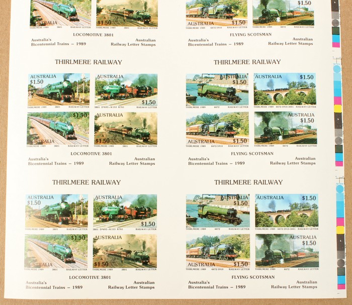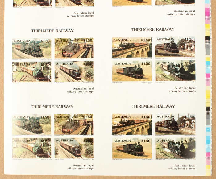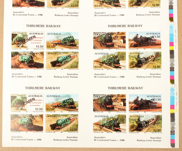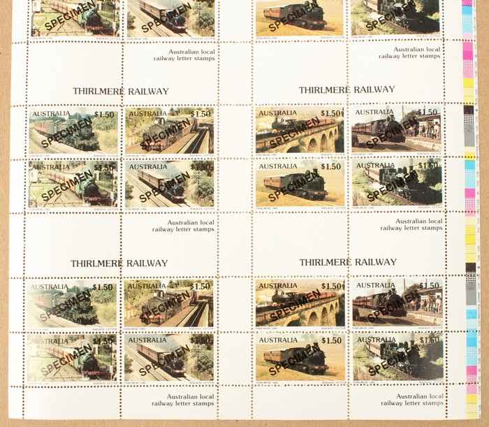 Thirlmere Railway $1.50 Letter Stamp in uncut IMPERF sheet of 8 M/Sheets (2 diff M/S), plus similar uncut sheets perf & imperf opt SPECIMEN. FV $144. VF fresh MNH. (3 sheets = 24 M/S) (Image1) (Image2)