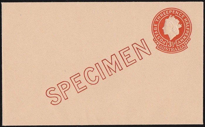 QEII embossed 29mm 3d green & 3½d orange UPU dies, plus 4d plum. All opt large SPECIMEN in red. Superb fresh UN. ACSC EP50w, EP54w & EP55w cat $450. (3) (P)