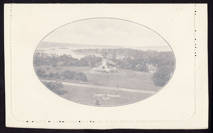 KGV Fullface 1d sepia 1st line ends 'any' on thick greenish stock, with view 'Mosman's Bay Sydney NSW'. F-VF UN. ACSC LC1(78A) cat $400. (P) (Image1) (Image2)