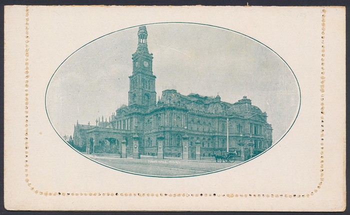 KGV Fullface 1d deep bluish-green, on white enamelled stock, cream inside, view 'Town Hall Sydney'. Superb fresh UN. ACSC LC12(133) cat $175. (Image1) (Image2)