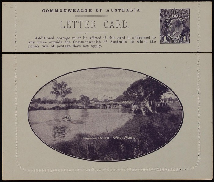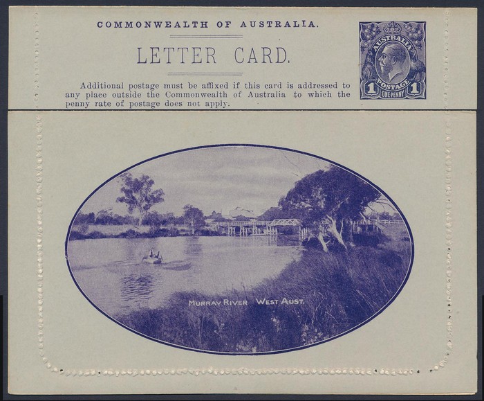 KGV 1d violet-black, die 1, perf 10, view 'Murray River West Aust'. F-VF UN, suntanned areas both sides. ACSC LC17(87A) cat $100. (Image1) (Image2)