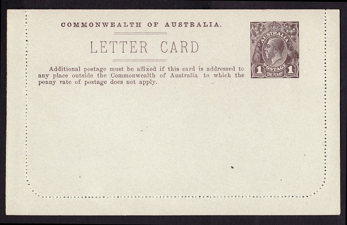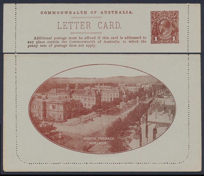 KGV 1d brown-black Die 1, perf 10, view North Terrace Adelaide. F-VF UN, front sl aging at 2 cnrs & margin stuck, view side superb. ACSC LC17(93) cat $150. (Image1) (Image2)