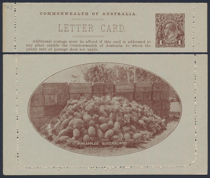 KGV 1d brown, die 2, perf 10, view Pineapples Queensland stack. Superb fresh UN. ACSC LC21(103) cat $150. (Image1) (Image2)