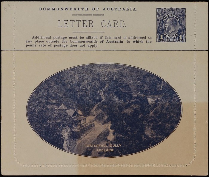 KGV 1d violet-black, die 2, perf 10, view 'Waterfall Gully Adelaide'. F-VF UN, suntanned area on view side. ACSC LC21(140) cat $150. (Image1) (Image2)
