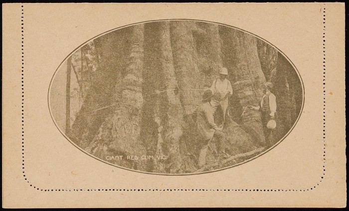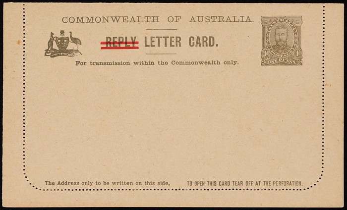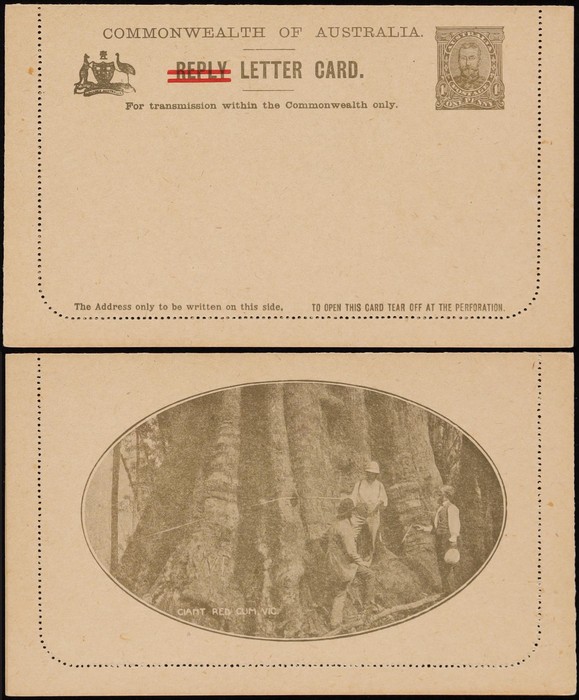 KGV Fullface 1d olive-grey reissued outer Reply card perf, view 'Giant Red Gum'. Superb fresh UN. ACSC LC31(50) cat $200. (Image1) (Image2)