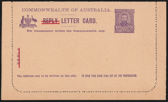 KGV Fullface 1d reddish violet reissued outer Reply card roul, view 'Town Hall Sydney'. F-VF UN, some roul reinforcing. ACSC LC29(133) cat $400. (Image1) (Image2)