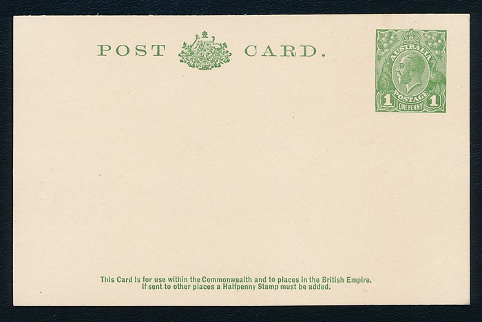 Official: 1924-30 KGV 1d green, Die I solid OS die type 1 white flaws on King & Emu. VF UN, suntan bands on reverse. ACSC PO6A cat $300. (P) (Image1) (Image2)