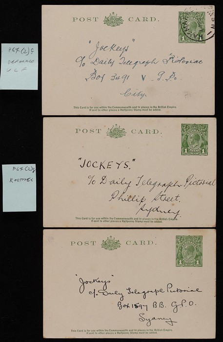1d green Die 3 sent mainly to Daily Telegraph claiming correct entries in Jockeys competition. Noted varieties deformed ULF (P64 (2)f) & ROSTAGE (P 64 (2)g). Mostly F-VF. ACSC P64 cat $370. Interesting Social History now almost 100 years old.
