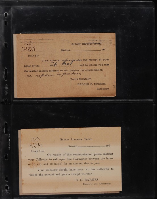 & U, then KGV 1½d brown, KGVI 2d violet & QEII 3d, plus PTPO KGVI 3d green Wallace & McGee (UN). Also perfin OS NSW (3) with Kangaroo 1d, KGV 1d green (2). Also non-stationery postcards OHMS inc KGV 1d red perf OS, 1940s-50s G NSW perfins (4),