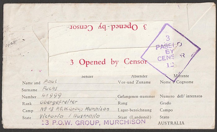 Air Mail 1/- lettersheet (code aw 200m 3/43), with 'Melbourne FEB 1944' machine pmk, from prisoner at 13 POW Group Murchison to Germany, with 'Approved for transmission?' h/s, plus censor label & h/s. VFU. ACSC POW2 cat $400 to Germany. (P) (Image1) (Image2)