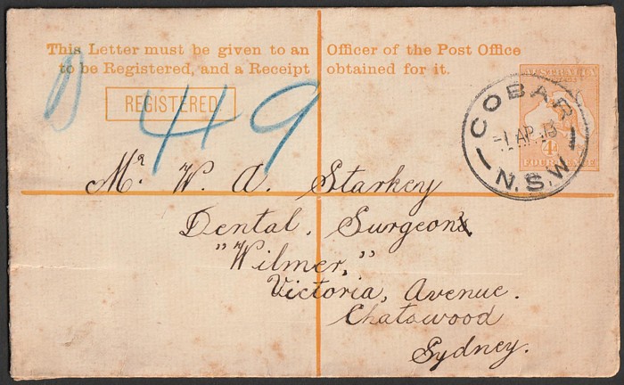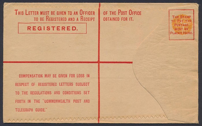 : 1913 Kangaroo 4d orange with 'Registered' box, text setting 2. GU, tones. ACSC RE1B cat $200. (Image1) (Image2)