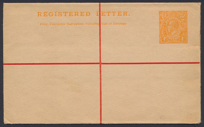 Envelope: 1913 Kangaroo 4d orange with 'Registered' box, text setting 1. VF fresh UN. ACSC RE1A cat $400. (P) (Image1) (Image2)