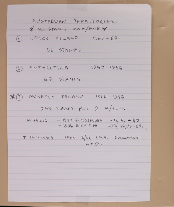 307 imageAustralian Territory MNH collection in 45 hagners with AAT to 2001 Centenary inc 1957 Pics to 2/3 Penguin (4 sets), 1966 Defs to $1 Mock Sun (4 sets), 1971 Treaty, 1972 Cook (4 sets) & 1973 Food Chain (4 sets). Retail $370 to end 1975, plus other FV $70. Cocos Island to 2000 Crabs inc 1963 set of 6 to 2/3 Bird Imprint blk of 4 (ACSC cat $275), 1969 Pics 4 sets ($40), 1990 $5 opt ($60) & other MNH Pic/Commem sets (FV$290). Total retail/FV $1065. (Image1) (Image2) (Image3) (Image4) (Image5) (Image6) (Image7) (Image8)