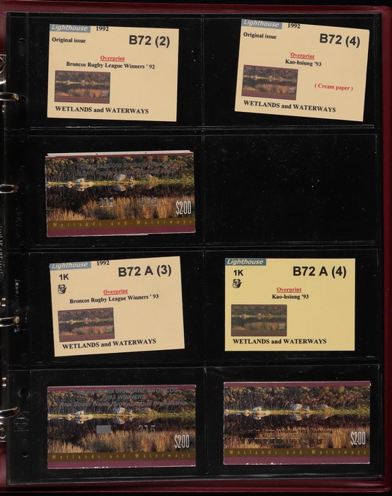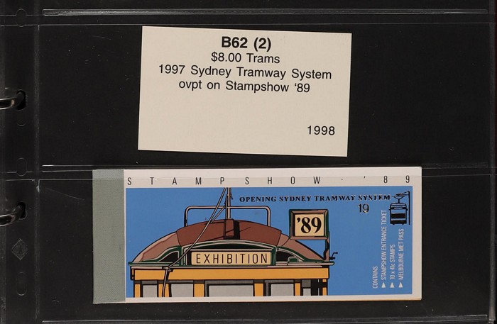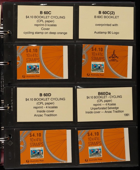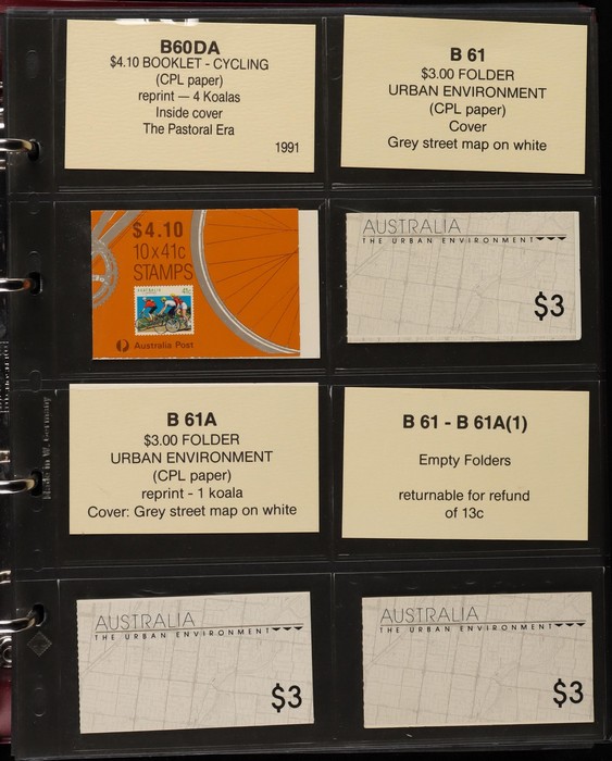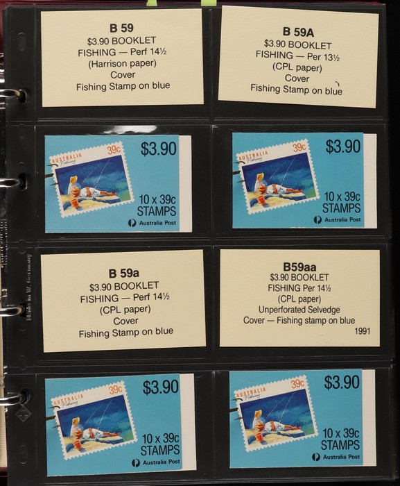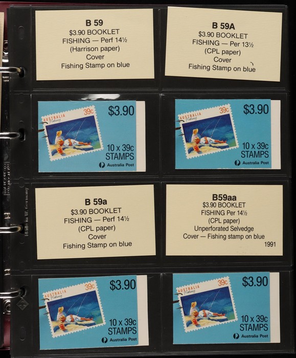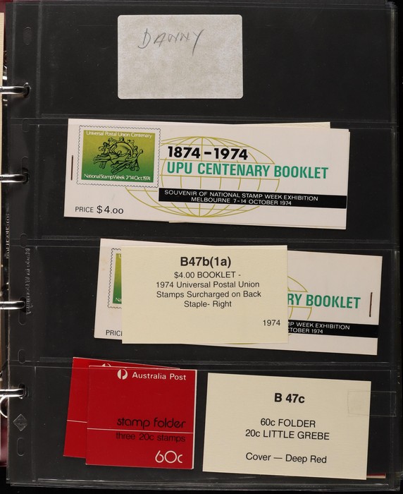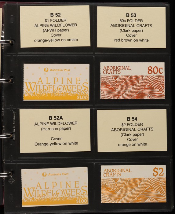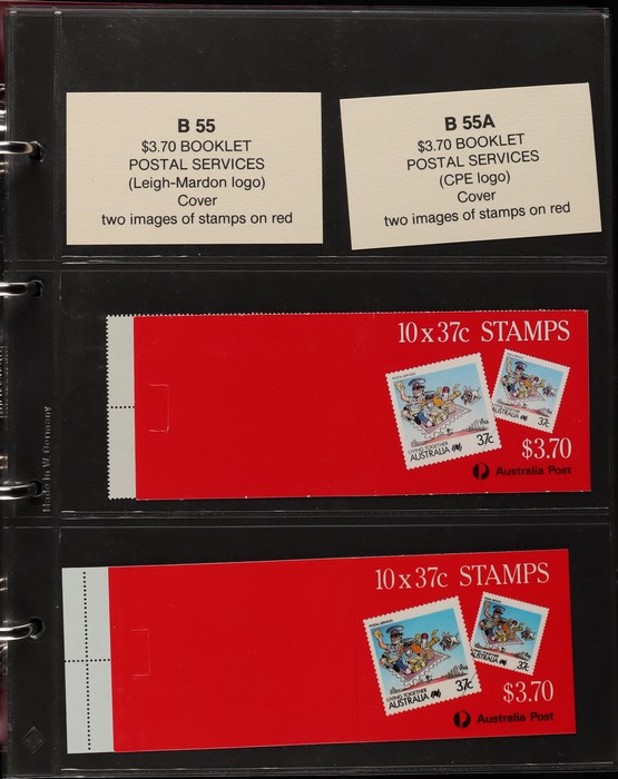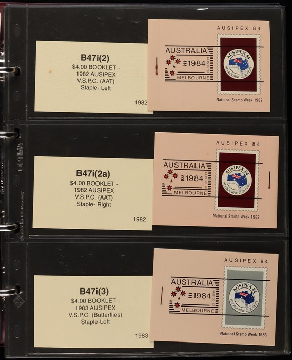 311 imageBooklets specialised collection 1974-97 in custom Lighthouse booklet album Vario pages + matching slipcase with inserts. A strong collection inc Semi-Official UPU booklets, Stamp Week/AUSIPEX promo booklets. Extensive range of later booklets inc scarce opt booklets inc 1989 Stampshow opt 1997 Sydney Tramway System' opt (cat $275), 1992 $2 Wetlands booklet opt Broncos 1992 NSWRL Premiers, 1989 $3.90 Fishing Harrison paper & others 120 booklets in total inc 22 opt for Exhibitions & Events. FV alone $360, cat value $1900. Album replacement cost another $100. (120) (Image1) (Image2) (Image3) (Image4) (Image5) (Image6) (Image7) (Image8) (Image9) (Image10) (Image11) (Image12)