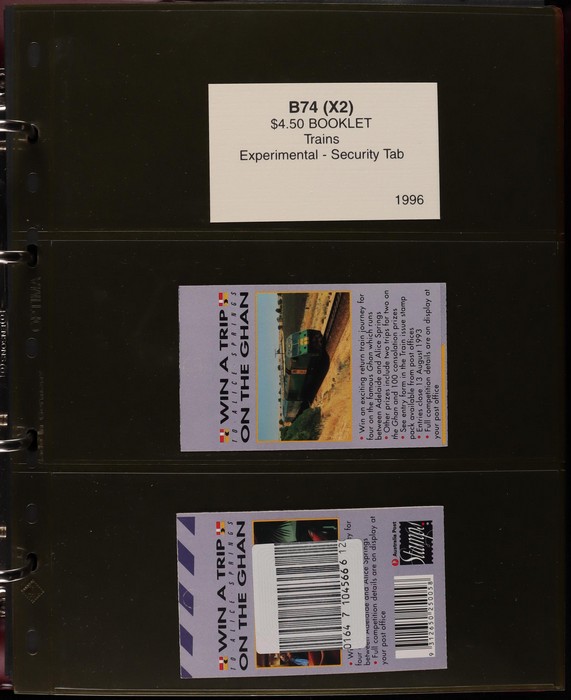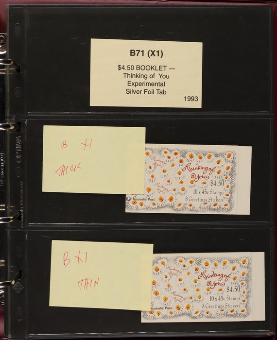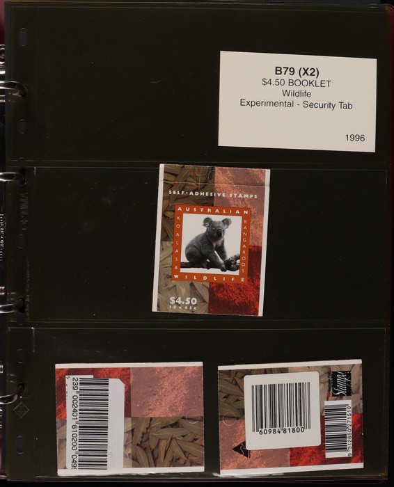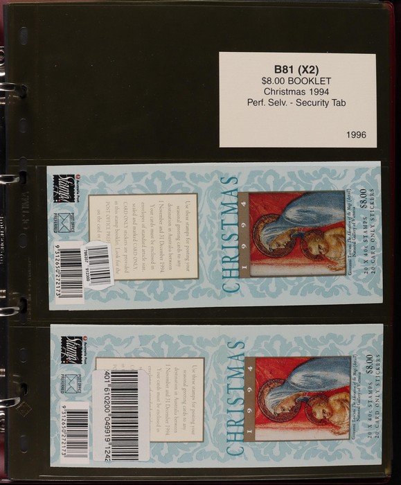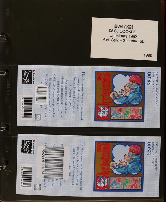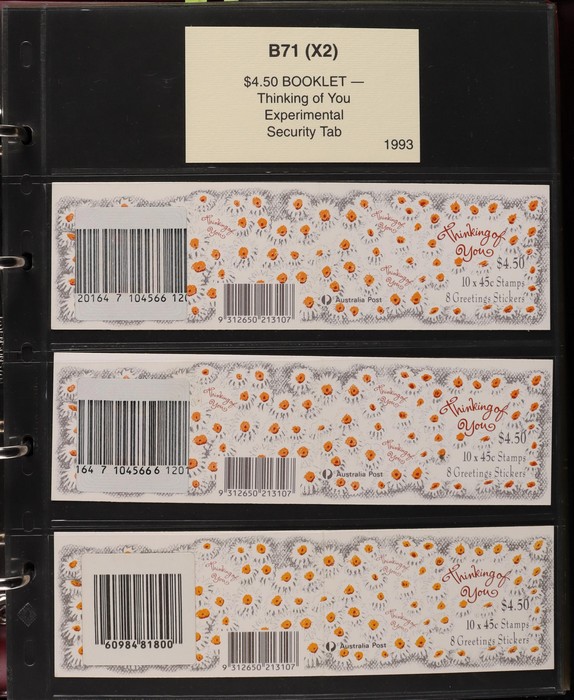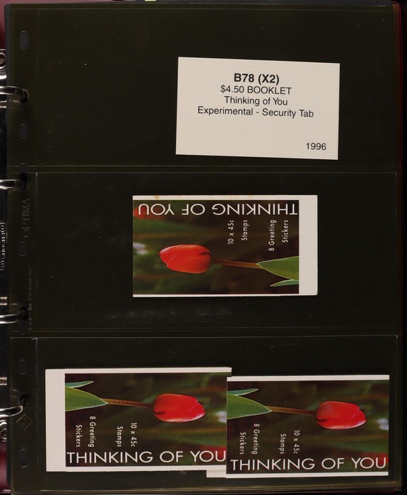 312 imageBooklets specialised collection 1993-96 of Security Tabs, large Tab, small Tab, foil strip etc. 65 different booklets from Threatened Species, ATM Triangular, Christmas & Commem booklets (FV alone $330). Scarce assembly Pfeffer cat $2700. Housed in custom Lighthouse album with Vario pgs & matching slipcase, retail approx $100. (65) (Image1) (Image2) (Image3) (Image4) (Image5) (Image6) (Image7) (Image8) (Image9)