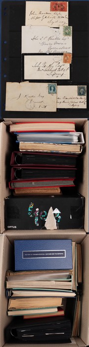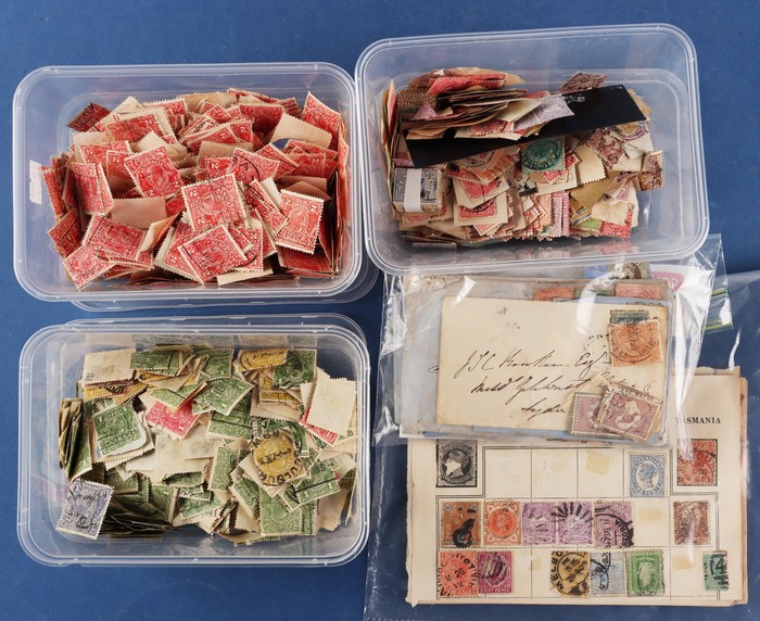 314 imageCharity 2 carton lot - 4 1850s-1920s messy accumulation from States (mainly NSW) to Kangaroos & KGV inc 1850-60s 12 NSW/QLD covers (mixed condition as usual), 3 plastic containers, 3 plastic folders of mixed States, KGV (mainly) & Kangaroos, 100+ 1d KGV reds on hagners. Noted 5d chestnut Kangaroo & 2/- 3rd wmk aniline-brown. Interesting lot as received. (800+, 12+ covers). 1900s-80s inc a loose leaf album with duplicated Malaya & States, BMA Malaya, Selangor etc. 1930s-50s to $1, PNG Birds to 10/-, 1966 Butterflies set to $2, Seven Seas Australian illustrated album 1913-80s with some stamps inc Navigators to £1 Mint, SG stamp album with World mix inc 3 pages of Australian Stamp Duty with high values to 3/-, Norfolk Island, various British Commonwealth etc. Noted 1948 Germany Russian opts 2pf-84pf. Usual variable condition with over 20 albums in 2 large cartons from various collectors. Sold on behalf of Mary MacKillop Charity. (7000+) (Image1) (Image2) (Image3) (Image4) (Image5) (Image6) (Image7) (Image8) (Image9) (Image10) (Image11) (Image12) (Image13)