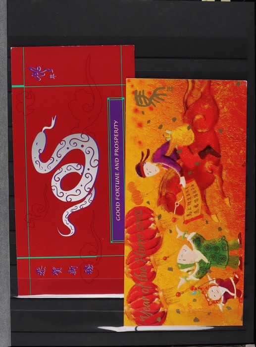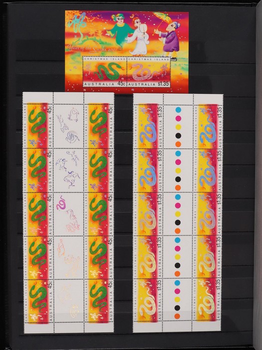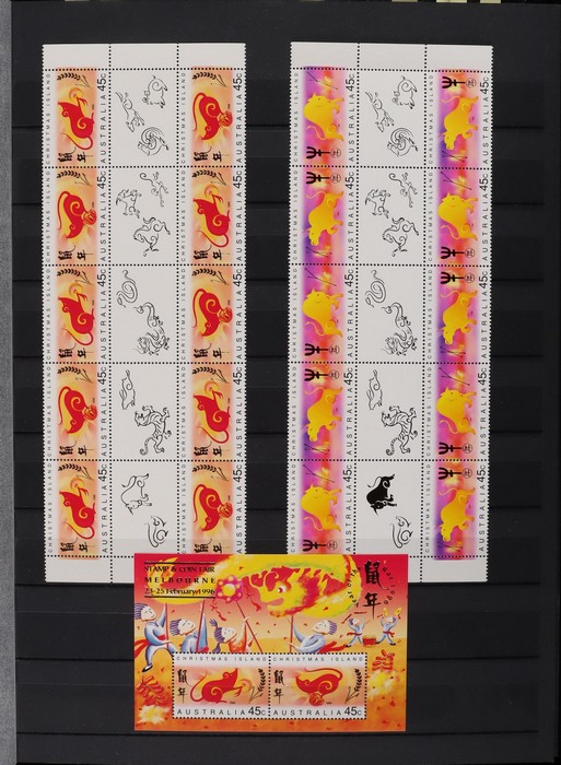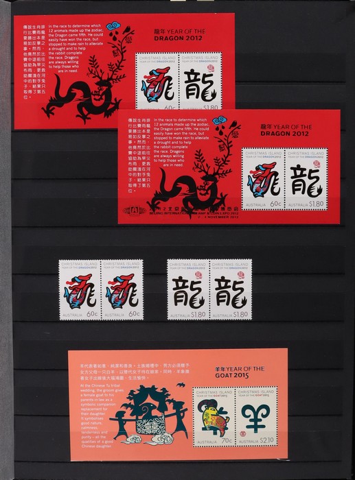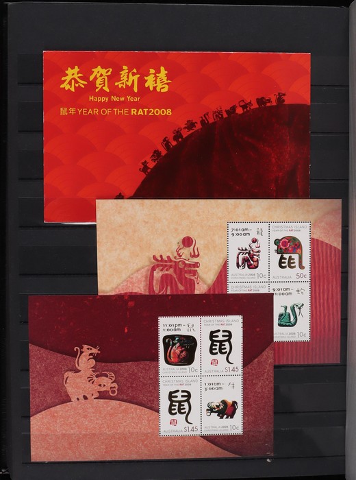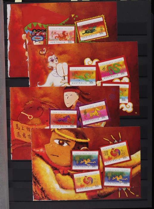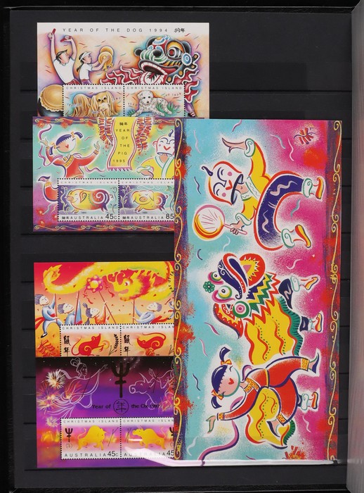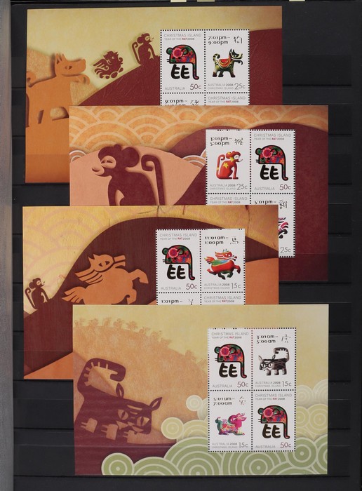 317 imageChristmas Island: 1994-2015 Chinese New Year collection with M/Sheets (31) inc Exhibition opts (6), large sheetlets (10) 2002-15, Lunar New Year Cycle sheetlets for 2007 & 2013 plus 2011 Phila-Nippon SES sheetlets. 1996-2007 gutter blks of 10 (9) inc 2001 set 45c & $1.35, 1995-2015 PO Packs (16 diff), 2008 Prestige booklet panes set of 6. Plus misc odds inc 2003 set cnr blks of 4. All fresh MNH, FV around $210. (Image1) (Image2) (Image3) (Image4) (Image5) (Image6) (Image7) (Image8) (Image9) (Image10) (Image11) (Image12) (Image13)