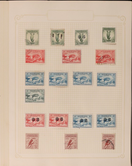 323 imageCollection in 11 large size s/books, albums & binders M & U. Inc a selection of Aust States (100+). Kangaroos inc 1st wmk 5d CTO (Melbourne) (cat $150), 3rd wmk perf OS inc 1/- small OS (10) G/FU (vat $650), 3rd wmk inc perf OS 1d to 1/- M (sl tone) (cat $1000+), SM 6d, 1/- perf OS M, also KGV G/FU, other pre-dec Commems with a mix of part collections stock albums with extras. Inc Lighthouse illustrated album for 1966-85, Seven Seas etc. Noted 1930s Commems G/FU, 1963-64 Navigators set of 6 to £2. Decimal inc FDCs, best item 197030c on Aust Post small Official FDC & others. Some mixed condition but mostly F/VF. (3000+) (Image1) (Image2) (Image3) (Image4) (Image5) (Image6) (Image7)