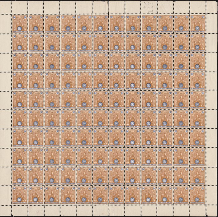 9d brown & ultramarine, perf 11, FULL SHEET of 120 with all margins. Stamps VF fresh MNH, some perf separations. ACSC N50 cat $18,000++ for M singles, should be at least double, $36,000 MNH. SG 351a cat £15,600++ for M singles, so should be at